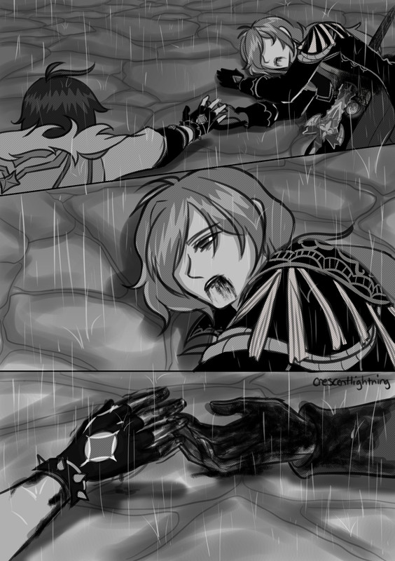 “Di..luc? You-” Kaeya started, but then Diluc slid sideways, falling to the side with a grunt, clutching his midsection with shaking hands, unable to pull out the Black Sword, his lifeblood leaving fast. He made contact with the ground with a resounding THUMP . No one on either side of the bridge moved, not even Kaeya, who stared down at this brother.