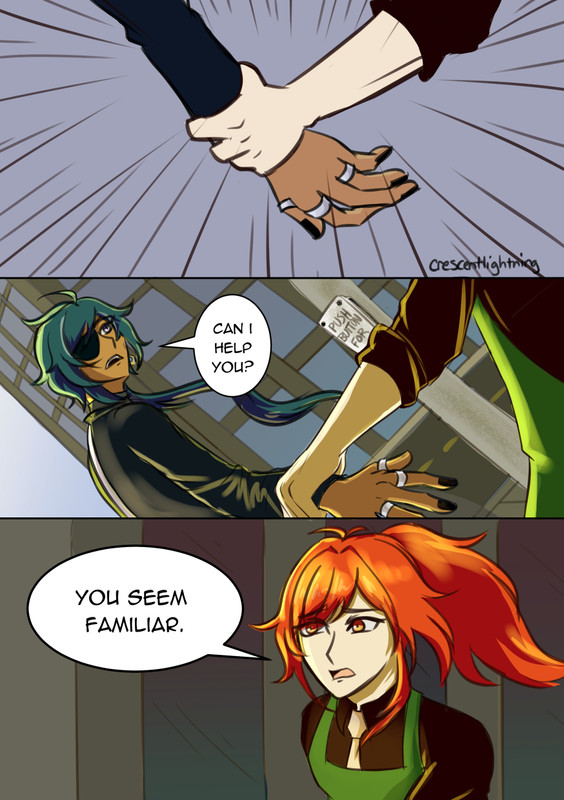 "You seem familiar," the redhead started. Kaeya raised an eyebrow, his eye darting towards their hands, where his wrist was still enclosed in a death grip. The redhead's eyes trailed down, following Kaeya's gaze.