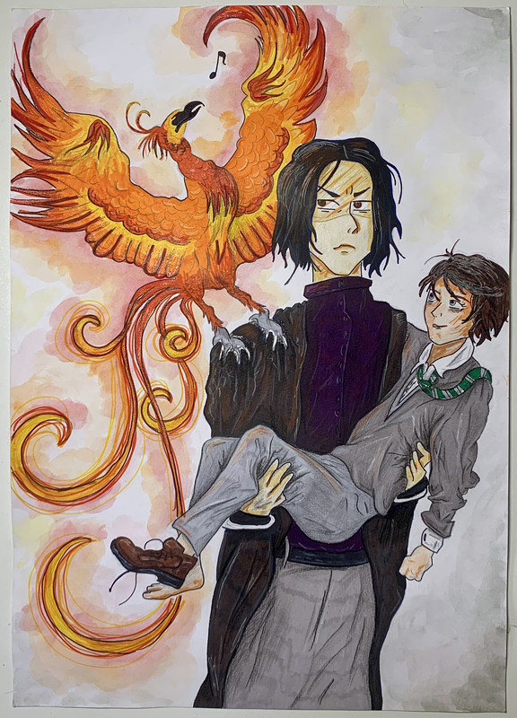 With a trill, the scarlet bird alighted on Snape's shoulder and peered down into her face seriously.