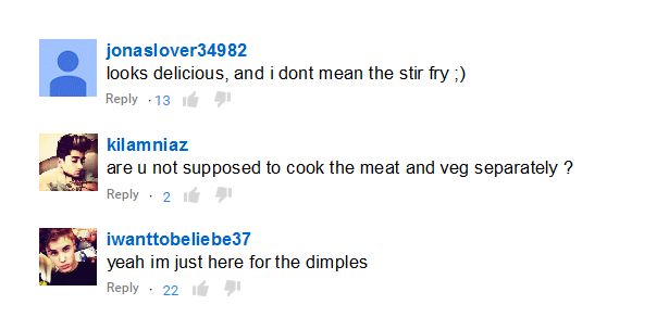 Another cut screen to Niall finishing chopping the meat and explaining how to tenderize and season it properly. The rest of the video goes smoothly; there are no fires, smoke, or beeping alarms. Louis makes an appearance in the last 12 seconds of the video to steal a bite directly out of the pan. The video ends with Niall laughing at him as he runs his burned fingertips under a stream of cold water.