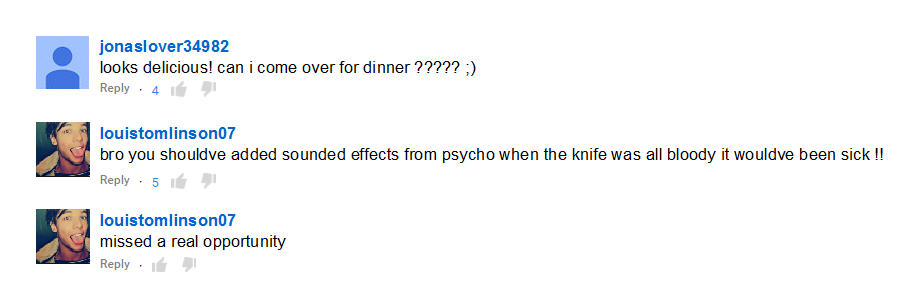 “Come off it, Niall. Your viewers love me. It's the only reason you can compete with Harry Styles.” Niall holds up the knife he still has clasped in hand, aiming the pointy bit just to the left of the camera. Pink-tinged liquid runs down the blade, dripping onto the small pile of chopped-up meat on the cutting board. No sound effects from the movie Psycho have been added, even though Louis left several comments on the uploaded video complaining that Niall 'missed a real opportunity.'