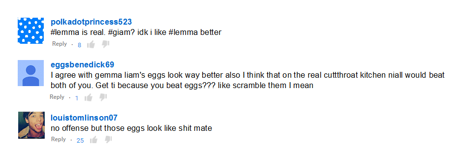 “Hold up. Are you trying to insult Harry Styles, or get into Jamie Oliver's knickers?” Louis' voice calls again. Niall's smile tightens, and the video's barely hit the 30 second mark. Loudly, Niall starts to explain the prep process, and nearly manages to drown Louis' cackling laughter out. The viewers will have fun deciding which animal he sounds the most like, and Louis will have more fun hitting thumbs up on his favorite comments.