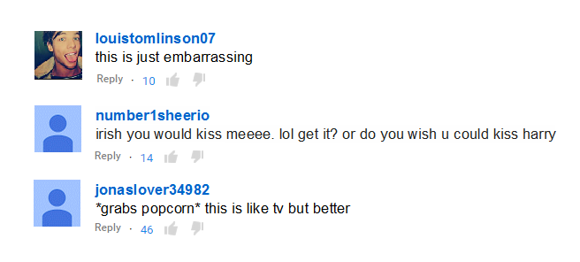 “Because your collab video would have to be posted on youporn, right?” Louis' voice asks from behind the camera. He must've stepped outside between takes. Niall looks straight into the camera with eyes that are silently screaming for help.