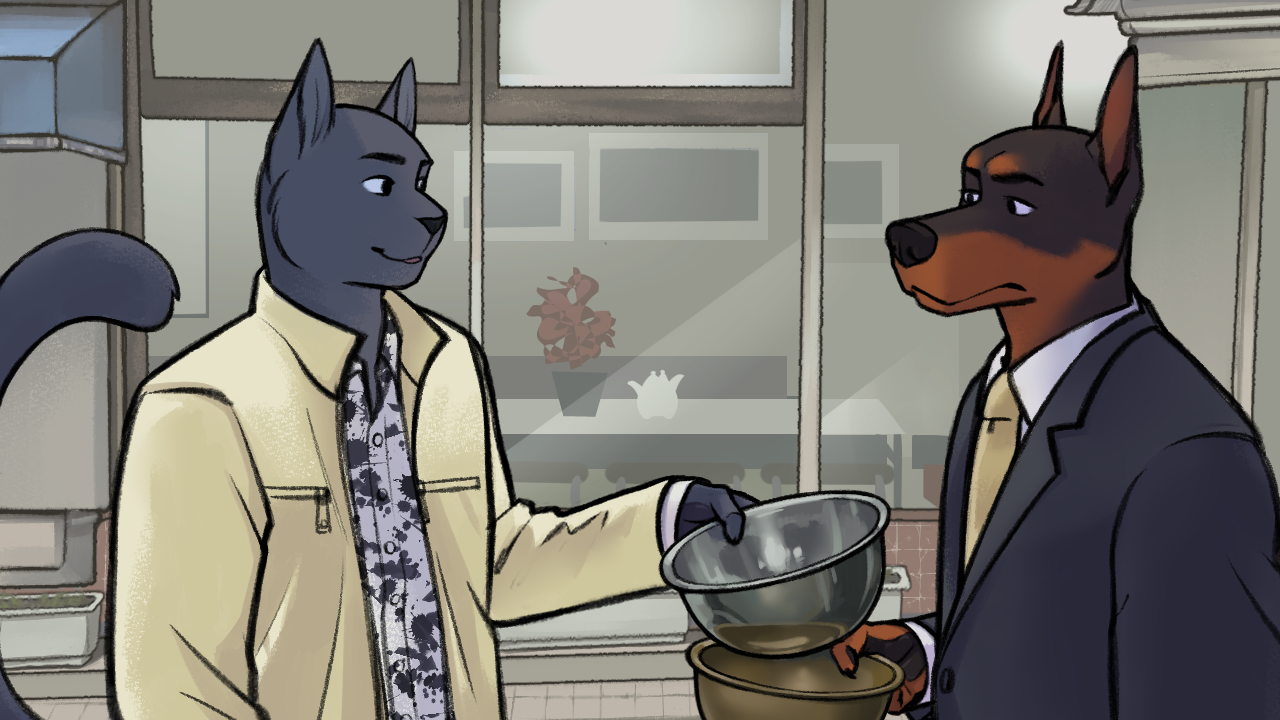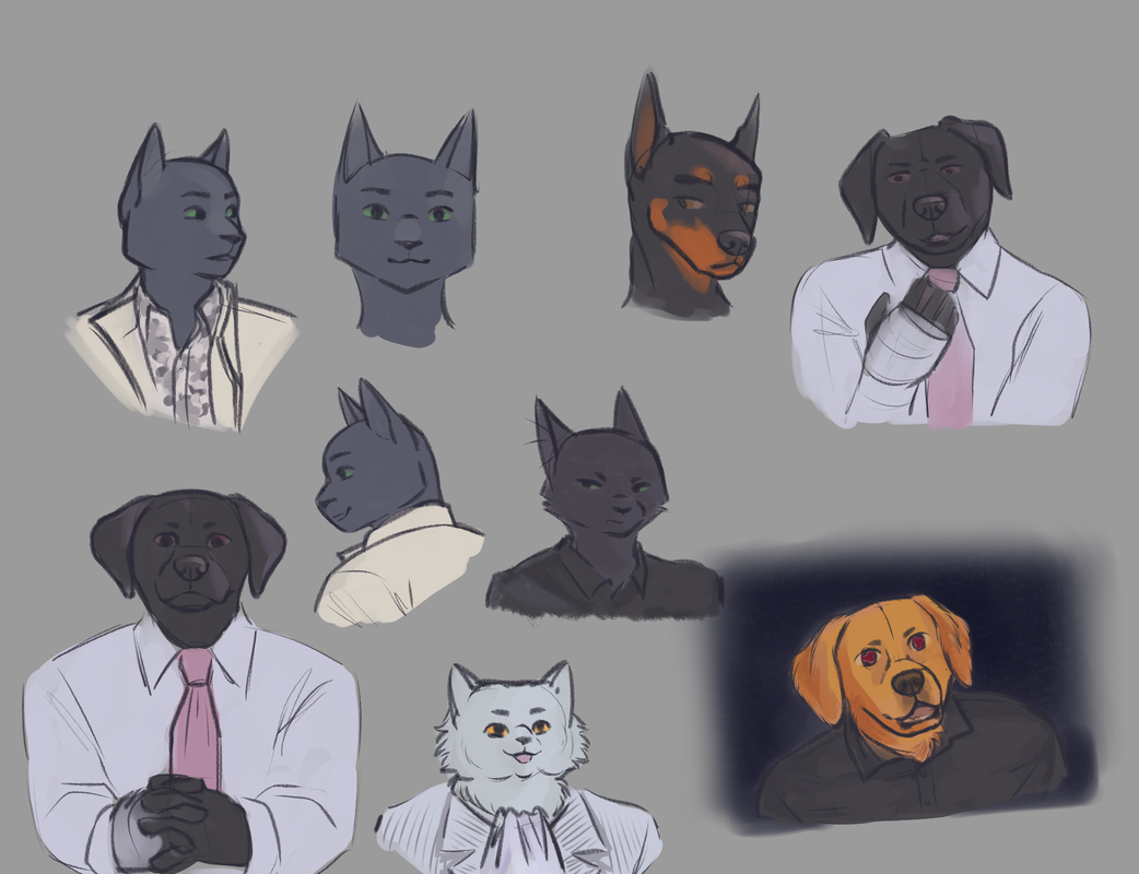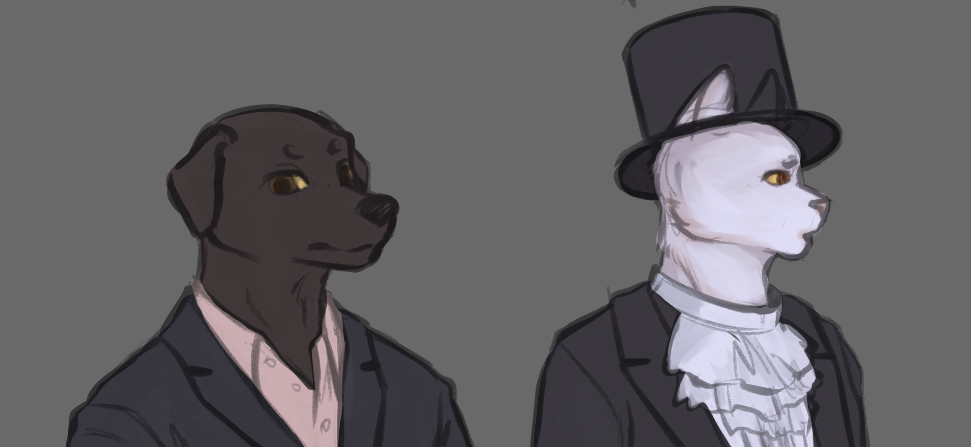 the darker grey/black cat and golden retriever are unrelated (they are jonathan sims from the magnus archives and hugo friedkin from dirk gently's holistic detective agency (2016))