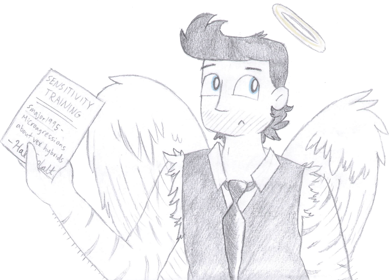 Is this a HALO issue? Is it really against ethics to have a chat with friends about who they’re asking out? Martyn sets his beak. He makes a light clack, but nothing much. “All right; let’s do that. But just to be clear, is this-?”