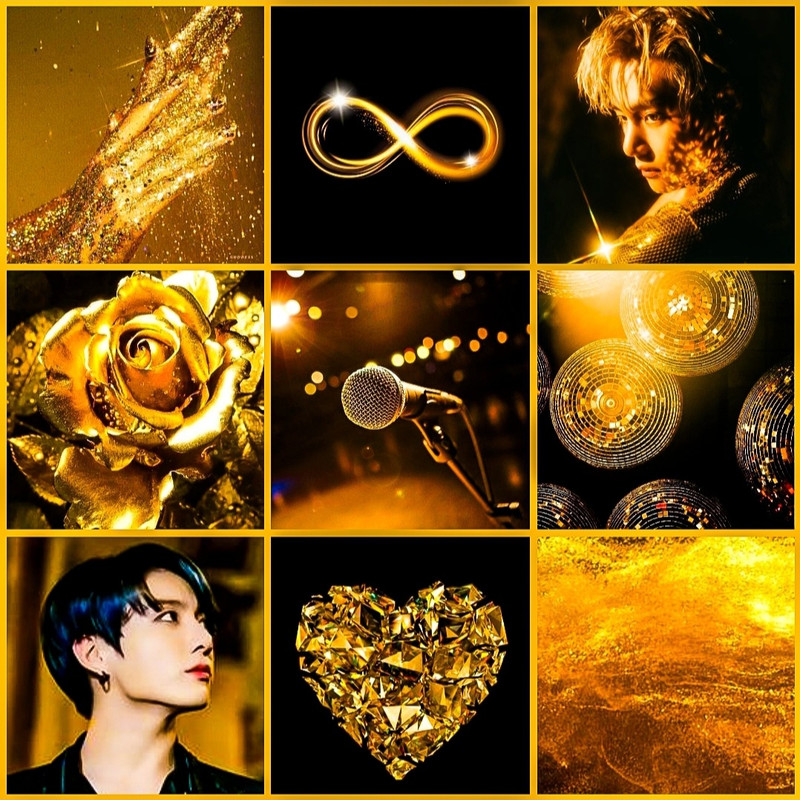 Taehyung bathed in a gilded radiance. Hair now golden from its usual chocolate locks, a gold sequence top paired with black leather pants and boots, his ears cuffed in more gold, his skin looking smooth and sun-kissed.
