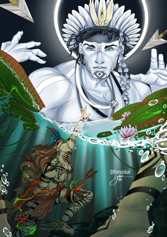 A white aura descended towards the river, reaching the corpse. The god hovered over the water, the whole sky became dark, and it was only possible to see the stars twinkling together. The closer they got, the more Jaci felt their heart ache. Seeing Noriaki’s body made them feel compassion.