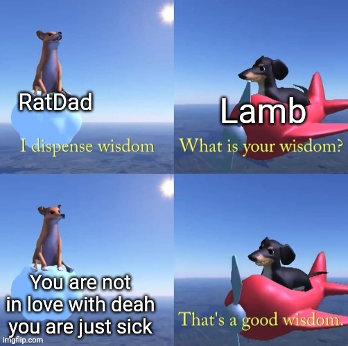"Yes, that is a vague summary of our dream three days ago. That doesn't answer whether or not this is a dream." The Lamb's voice is muffled, and the feline immortal is rubbing his cheeks on their horns. "Last question. Do you know who is our first love interest?"