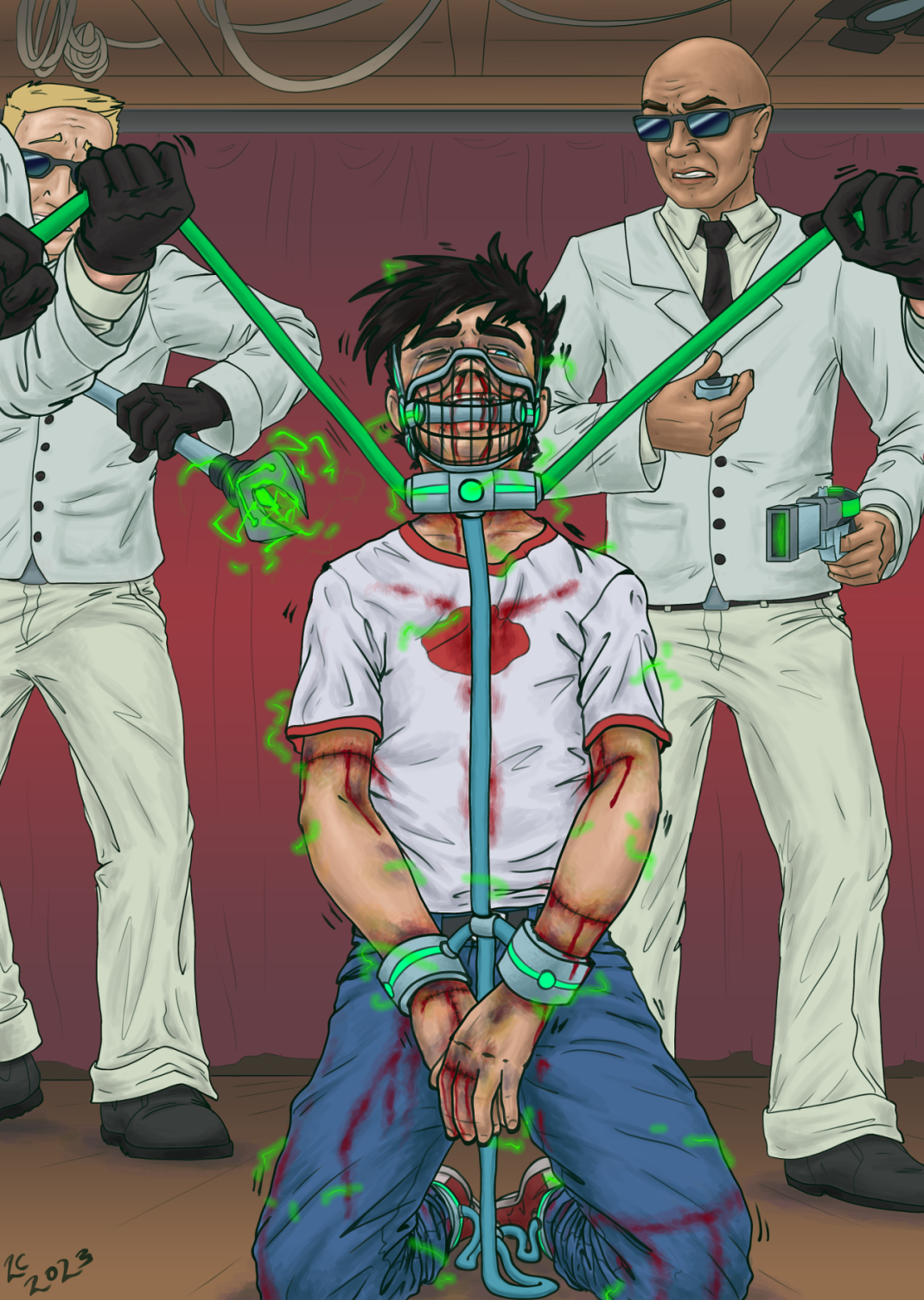 It was nice to not see the scars that covered nearly every inch of his body, even if they pulsed with pain that still left him acutely aware of them. He almost looked like himself again - if he ignored the glowing green cage over the lower half of his face, connected to a collar circling his throat, skin severely burned along the edges of it all. The edge of the muzzle dug into his skin and the gag between his teeth forced his jaw open. It had stolen his voice, stolen away his ability to scream and beg for mercy.