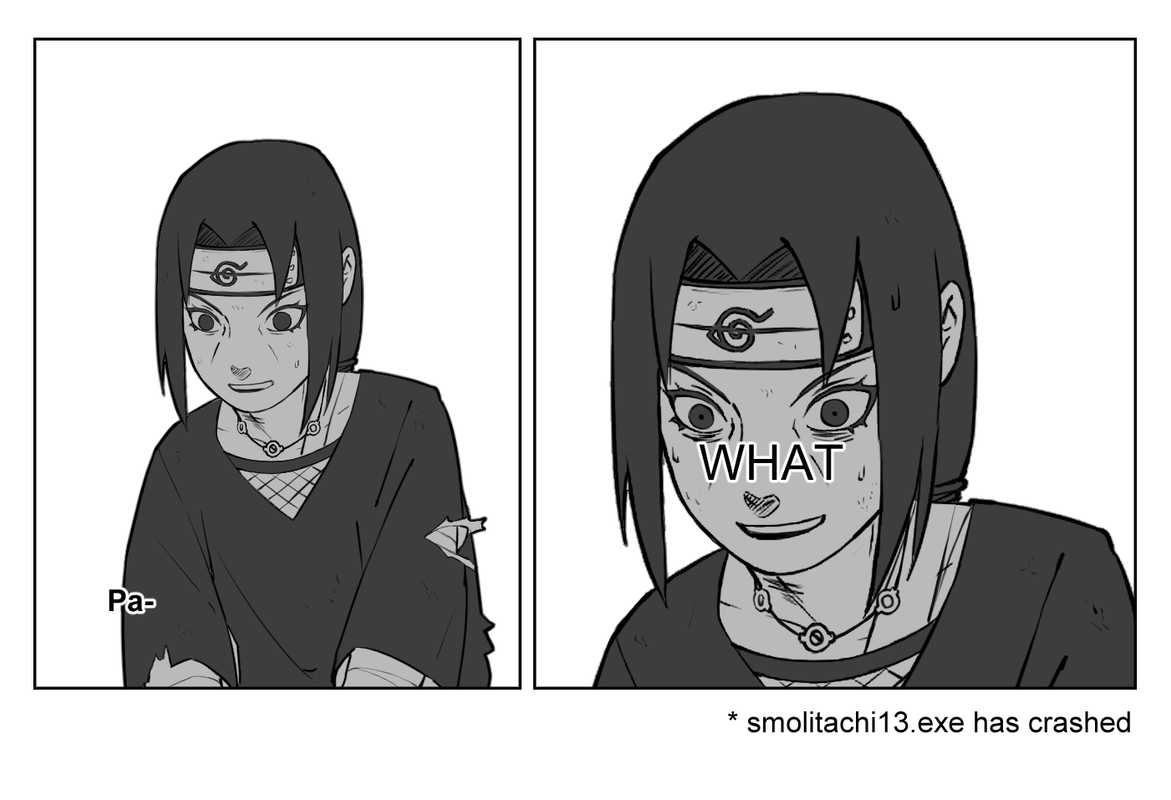 This was insane. She really hadn’t noticed at all. But seeing those slanted, onyx eyes now, she couldn’t help like a younger version of her father was staring back at her. You’d only need to remove the deep tear-throughs and the ponytail, and essentially, you’d have a carbon copy of Sasuke Uchiha.