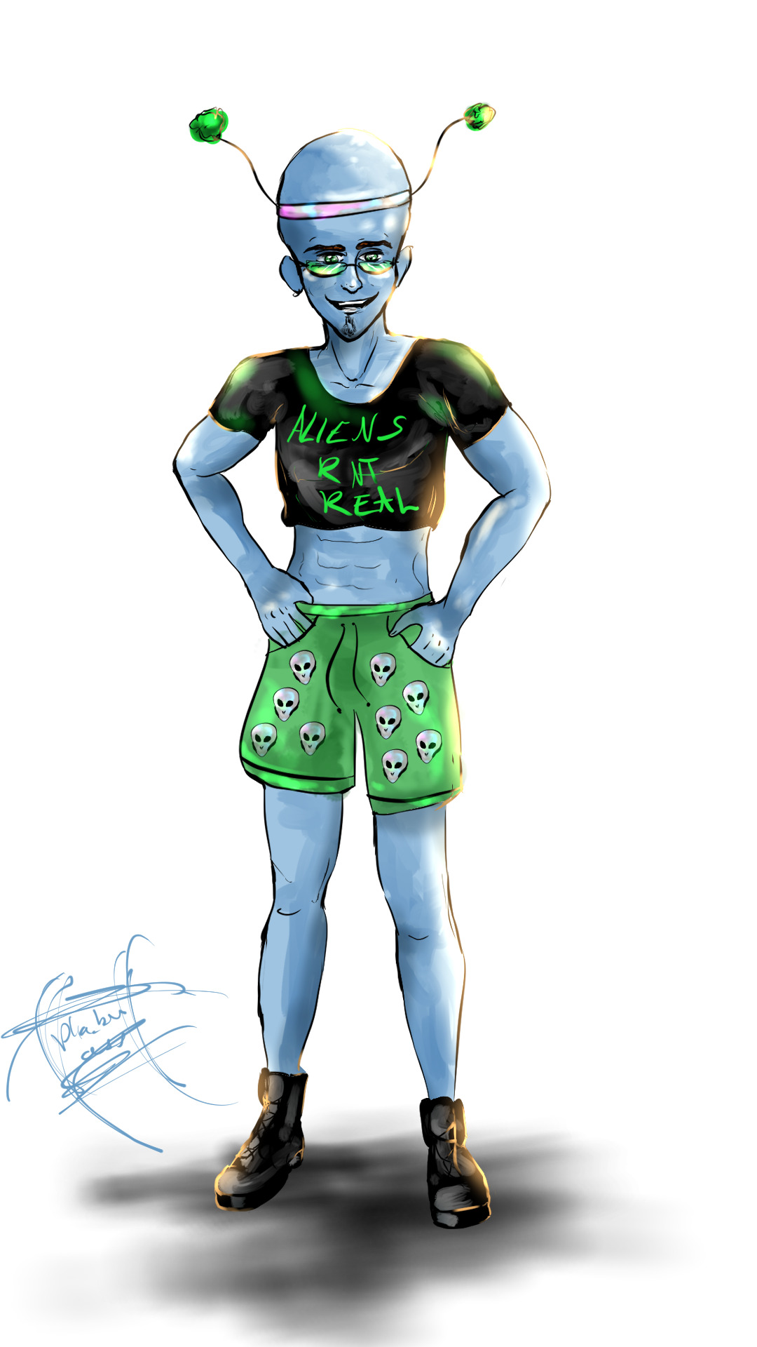 The blue man is jumpy. Just a little bit. He's nervous, uncomfortable. His eyes flick around, taking in his surroundings even as he grins and laughs. That's all right, Harlow isn't worried about being caught staring. He isn't staring; he's good at watching people unnoticed.