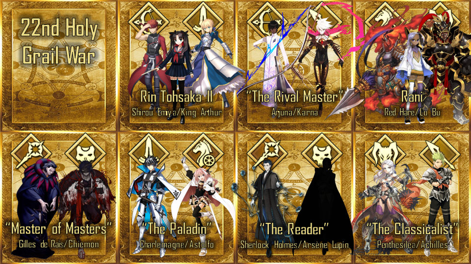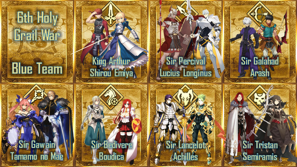 Originally, the Servant assignments were rather different, since I was aiming for duos that complimented each other in terms of abilities, rather than personalities. But as I found better choices for the Servants, the duos changed considerably: "For Bedivere, the mystical Caster. For Gawain, the precise Lancer. For Galahad, the sharpshooting Archer. For Percival, the swift Rider. For Tristan, the stealthy Assassin. For Lancelot, the overwhelming Berserker. And for King Arthur, the mightiest of all the classes: the sword-wielding Saber."