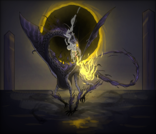 And then a low, rumbling answered her, shaking casing and strut as the ground beneath her quaked. Her gaze shot up towards the sky, at the roaring singularity blazing as if some dead sun. The rumbling turned into a hiss, turned into a growl, turned into the dull throbbing roar as something dark and huge flew through the air. She took a few shaking steps back as the massive creature slammed into the ground in front of her, roaring and baring fangs as big as she was at her. Wings of death dark ebony spread in the air, claws reaching for her as a lean tail swept back and forth. Eyes as gold as molten sunlight pierced through her very core as that jagged maw opened wide with light pooling…