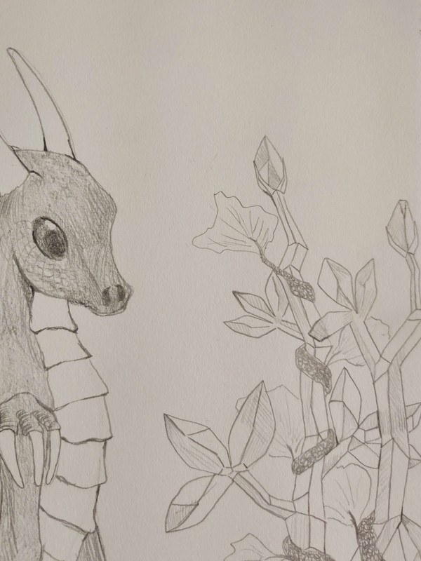 “Oh, I bet she loved that. Well, Alina, see what few mortal eyes have! The Crystal Rosebush. Not to be confused with crystal roses, which are alive and edible. It was given to us by some fae, some time ago as a return for a favor. Sadly, it is overcome with a rather pesky weed. Seeing as Rosebriar does not have opposable thumbs and my thumbs are talons that will damage the crystals, I suppose I will have to make do.” The rose dragon let out the world’s weariest sigh.