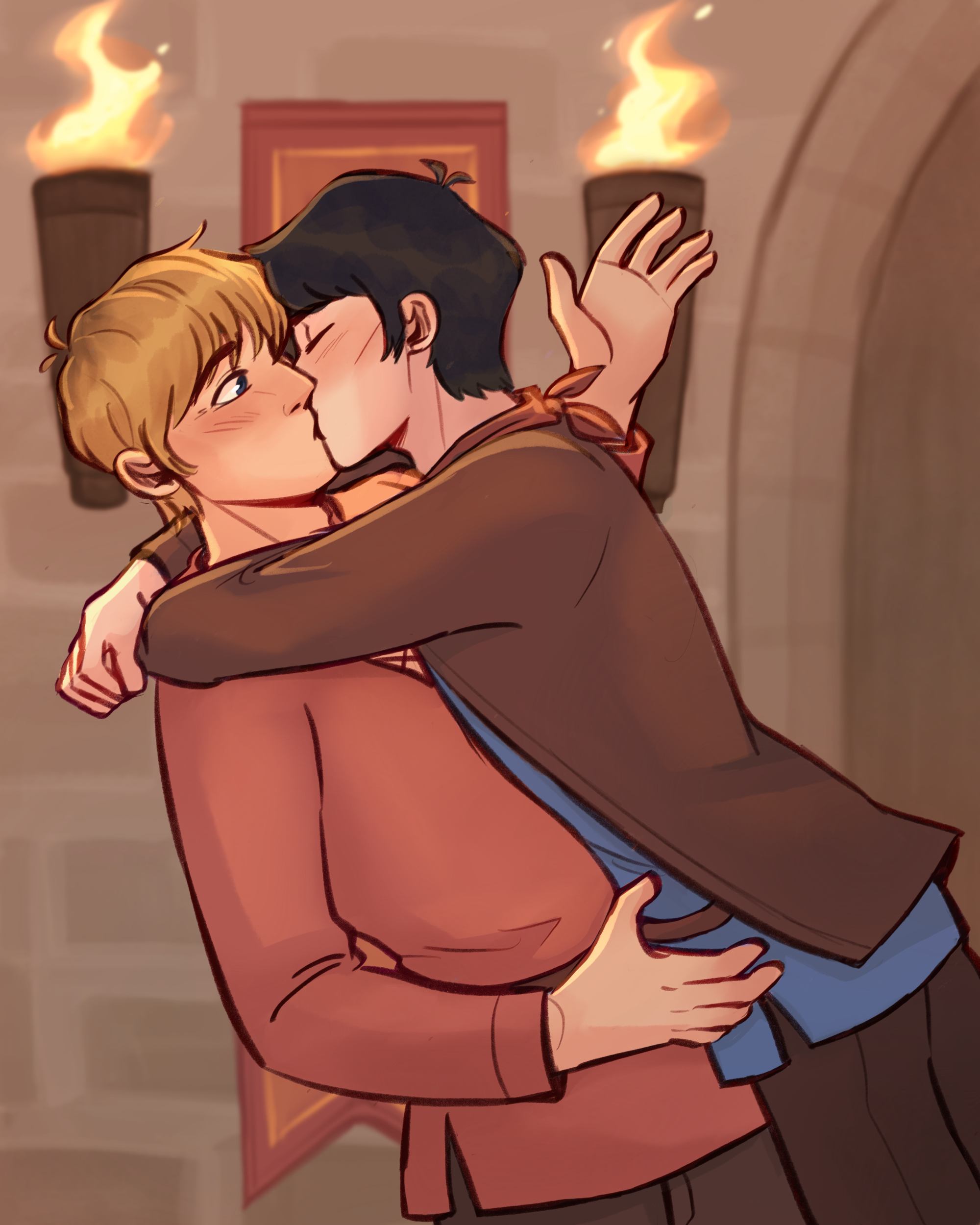 “Before Arthur has any idea of what he is doing, Merlin’s arms wrap around his shoulders, and he stumbles backwards as their lips collide, struggling not to fall from the force of it.”