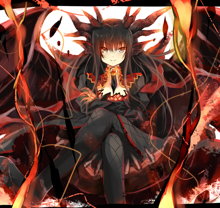 It was a girl, she seemed to wear a black and red colored dress with a necklace and a crimson cape draped around her shoulders. her wings were black mixed with crimson, her horns were somewhat asymmetrical. and a spiked tail colored in black and crimson. And of course...quite the breasts too. "I think she's around C Cup. or larger than that." commented Issei drooling a bit. "[Partner i thought you threw your obession with boobs when we went here!?]" wailed Ddraig in dismay. "I'm not being a pervert! I'm wondering what she looks like!" yelled Issei annoyed as the girl chuckled and flew downwards to them. "My my...it seems that you were entranced by my beauty after all...this must be fate...my fated mate..." whispered the girl clearly happy.