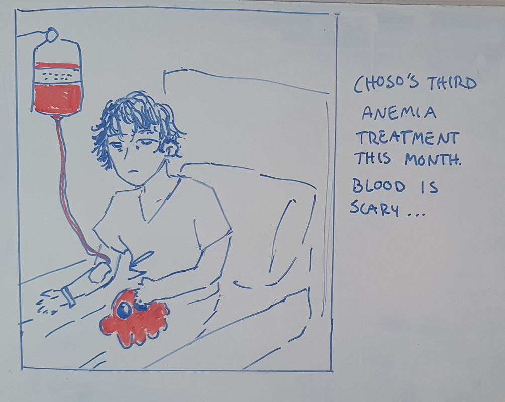 “You told me before that you have anemia and spent some time at the hospital,” Choso nods, he remembers telling Geto in the first session when asked to briefly give him an overview of his life.
