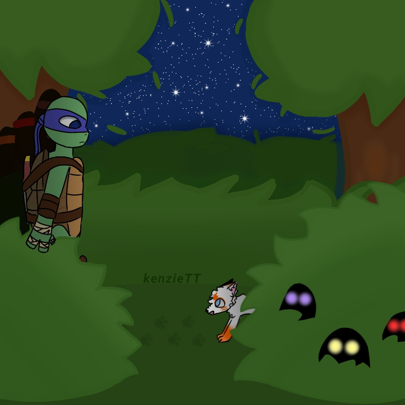 "Ele provavelmente está se escondendo, ele poderia-" Donnie foi interrompido por um som em um arbusto semelhante a um rosnado, todos congelaram instintivamente