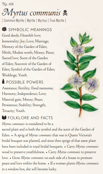 “Myrtle. Neville was telling me about some of the plants he used in his own research and recommended it to me. Said all this stuff about its history, but I’ll be honest I didn’t catch much of it. Just that it meant independence, stability, and tenacity.”