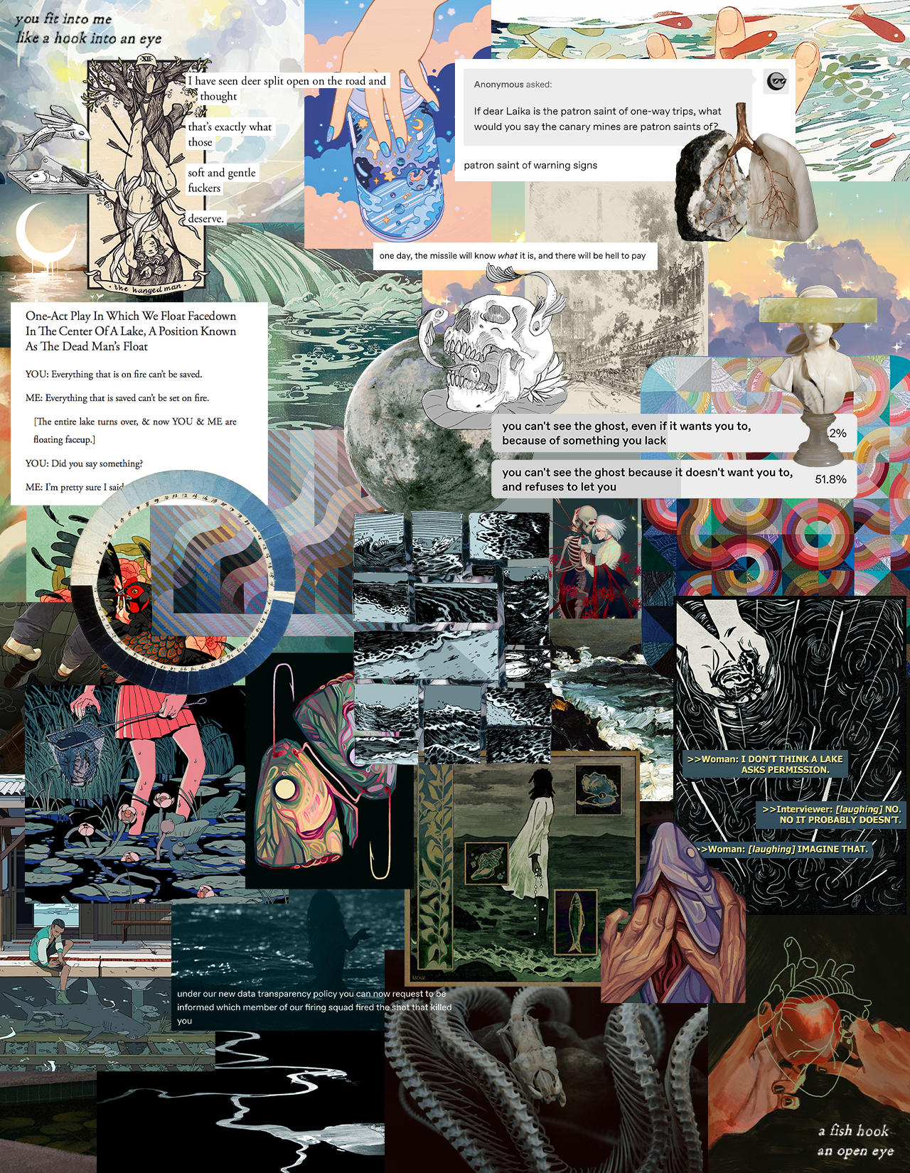 [you fit into me] - margaret atwood | wanderer's orbit - tofuvi | the fyodor pavlov tarot | meyoco | ka (marukogedago) | salvage - hedgie choi | shitty horoscopes book ii: anger - amrit brar | patron saint of warning signs - cemeterything | catch your breath - debbie baxter | reflecting - tofuvi | the waterfall - mabel royds | one day the missile will know what it is - biggaybunny | byproducts, from english war work - joseph pennell | tofublock | shitty horoscopes book vii: magick - amrit brar | see no evil - debbie baxter | one-act play in which we float facedown in the center of a lake, a position known as the dead man's float - dalton day | ghost poll - cemeterything | aurora - michael james | inverted moon - dawid glawdzin | tofublock | crosscurrent iii - michael james | cyanometer - horace-bénédict de saussure | koukouvayia | water - choodraws | styx - kaysha siemens | lian yao | kevin davis | rough seas near lobster point - robert henri | the storm, it gains - stzero | pondwater - choodraws | hooked on you - quezify | lake - jessica hayworth | sea, swallow me - ra3kiv | how to gut - quezify | kohei and the high tide tracks - cassandra jean | ask the dust (2006) | under our new data transparency policy - cemeterything | in that dream, you wandered far into a wicked, wasting garden - dappermouth | afterlife - nydia lilian | visitant - vacantia | ghostember | [you fit into me] - margaret atwood