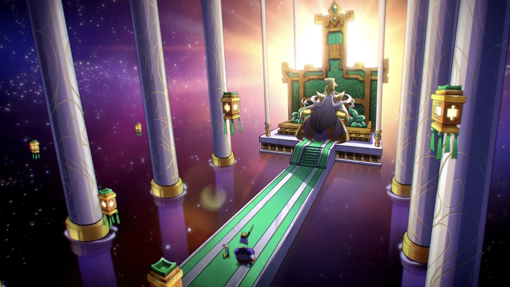 The Hall of Divine Mists is where the Great Benevolent Sage of Heaven, the Celestial Jade Emperor, holds court. Floor indistinguishable from the ceiling, resembling the cosmos, stretches infinitely in all directions. Constellations and galaxies adorn every space, celestial bodies seemingly reachable with just a raise of hand. A straight hall with jade carpet underneath indicates the center of the room, ivory pillars on both sides marking the place for deities in attendance to stand during sessions and floating lanterns high above giving light in the vast expanse of darkness.