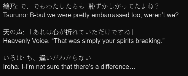 Christmas String is once again an excellent example of both their bond (although sadly they spend most of the event in Work Mode) and their growth over the years—which they acknowledge themselves in the event, MGS, and quotes. In that event, they were kind to two children they didn't even know and even went out of their way to help them, despite claiming many times that they’re not kind people and “aren’t that type of person” to help others. They specifically cite that as a thing Ui is capable of, something Iroha does, but not them of course. In light of what I just said about their own perception of themselves, however, they would literally never recognize that they are actually kind people. They did so many unnecessary nice things for others even without the diary's influence in that event alone, and if you look at them you could tell they were pleased and happy every time they saw that they'd helped someone. They just genuinely believe that to be kind, you need to be Ui/Iroha. They were most often around people like Ui and Iroha, who basically emanate an aura of light and kindness and empathy, and it seems to come so naturally to them, so surely if it doesn’t come as naturally to Touka and Nemu, it means they’re bad. And they can quite literally never be Iroha/Ui. They say that themselves.