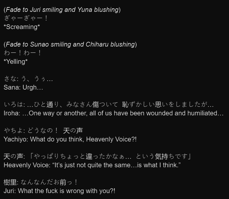 If you think about it. Do the others ever sit down with TouNemu and talk to them? Do they really? Or do they basically only pay actual attention when TouNemu inevitably make a mistake or do something they don't like, to berate them for it like they're misbehaving dogs? No wonder they isolate themselves and can only open up to/rely on each other. They have no one else. Even Iroha and Ui are comparatively distant now. Not to mention, these two probably believe they're everything from hard to love to incorrigible to perpetually evil, cannot be good or do good, etc. Do the others ever praise them when they do something good? Is there ANY positive reinforcement at all? I have not even touched f4's funny child abuse joke about how Kanagi dishes out corporal punishment to these two. The instance of it in Paradise Shift boils my blood personally because EVEN WHEN THEY DO A GOOD THING THEY GET PUNISHED. And guess what their reaction is? Nothing. Just a complaint on Touka’s part when they’re in private about how it still hurts. That’s literally the reaction of a child who’s been hit by their parents all their life and doesn’t know anything else, or alternatively the reaction of someone whose belief about deserving that punishment is deeply rooted in them and so they have no reaction to it. In my humble opinion, these two are literally saints, I would have snapped a while ago if I were them. Especially because literally no one has noticed or acknowledged their growth at all (other than each other). Ui and Iroha, supposedly the people closest to them other than each other, still thought they would fight until they came to blows as late as Mokyu's MGS.