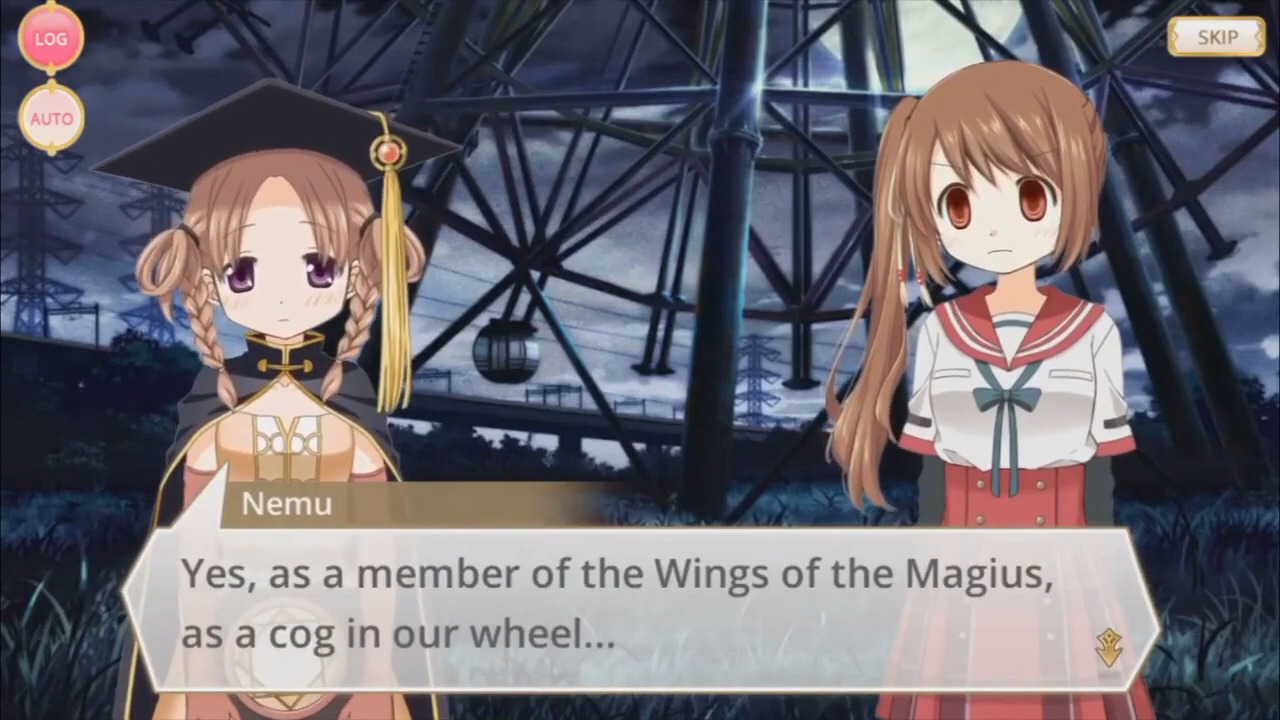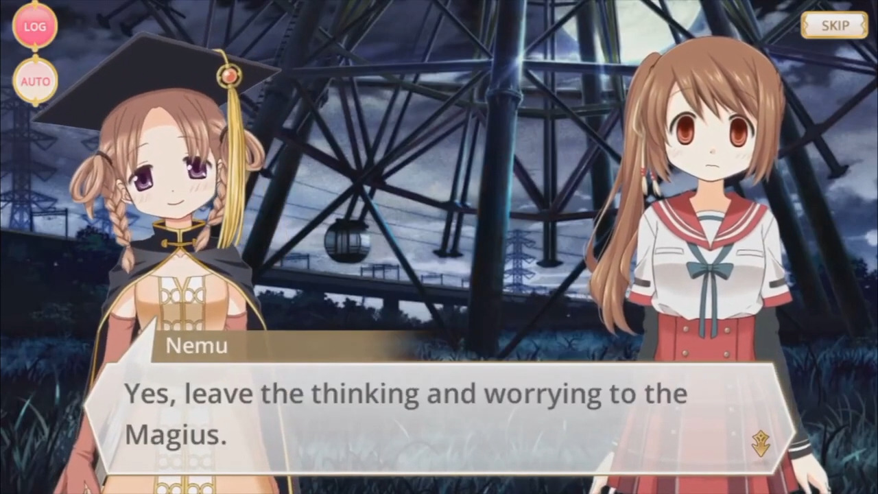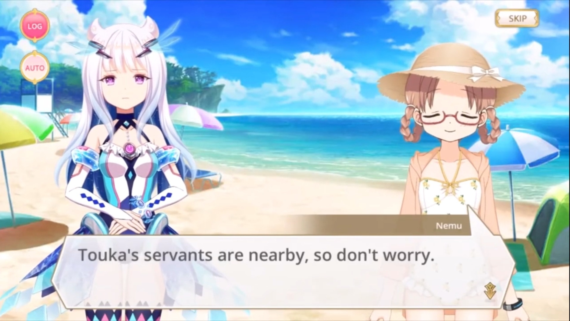 The next time there’s a Magius meeting, this time to decide on a name for their base, Touka is again the one who asks Nemu for her opinion. It’s important to note that Touka is never once hostile, aggressive, or even annoyed when she does this. She considers Nemu’s thoughts and feelings more than anyone. Heck, Nemu would have no way to doubt Touka’s care for her considering their history and the way she acts. Now I get to talk about the relationship between Magius Nemu and Magius Touka. If I start gushing incoherently, I apologize in advance. I covered a bit of Magius Touka’s attitude towards Nemu in the essay dedicated to her, and slightly in this one, but now I want to draw attention to how incredibly sweet Touka can be when it comes to Nemu. Nemu desperately needs that reliability and that love Touka provides, the hope she brings. And Touka is the one person who openly shows her care, attention. Over and over again. Touka considers Nemu an equal. During the main story, as I said in my Magius Touka essay, she shows concern for Nemu’s health and wellbeing when no one else does. This goes beyond her magic-given affliction! I only wish we had more bits and pieces from that era, but as for what we do have… Well, I have to point at Nemu’s swimsuit costume story for the easiest and shortest point of reference. I’d use screenshots, but if I did, I would just end up showing you every single piece of dialogue and expression.