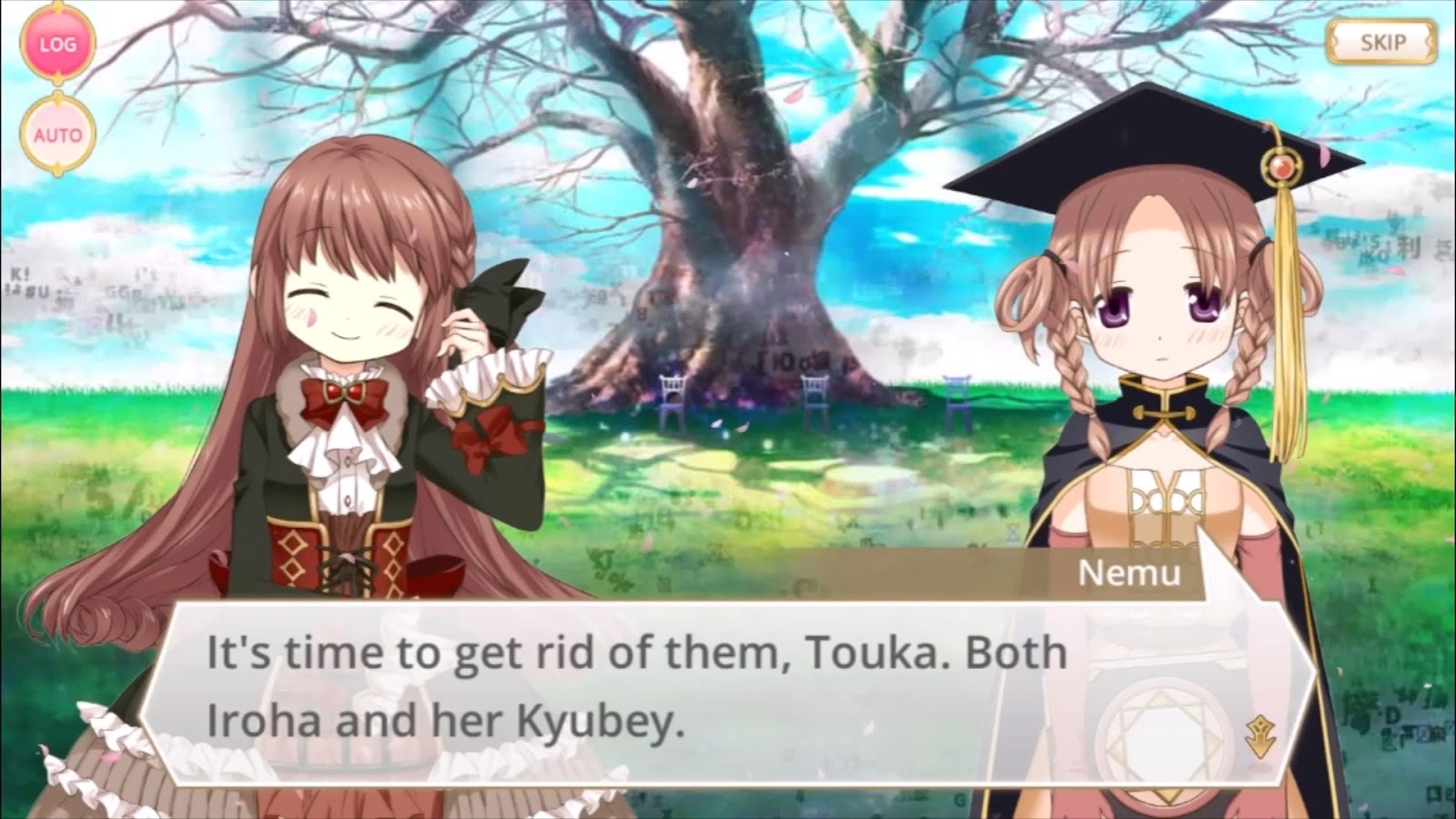 The way she always emphasizes the genius aspect of herself and even uses it as an excuse and brings it up so often feels like that's all she sees herself as. Nemu gives, yes. Nemu has similar issues. But hers are much, much more obvious. Less concealed when you bother to examine her. Touka gives without measure, without the slightest care for herself. She's selfish and at the same time one of the most selfless characters. There's also the interpretation that, at their very core, Touka and Nemu both just wanted to live. But I feel like that was only at the beginning. If that was all there was to it, the plan would not have continued with Nemu's life at risk, Touka would not put herself in the line of fire. Essentially, Touka has taken on way, way too much responsibility, as well as crafting several masks. Don't forget, just like every other magical girl, she led a double life the entire time, and she financed a lot of the cult's operations. Though I don't have any doubt many of the richer members contributed to the budget with their ridiculous allowances that they do not use. But listen. Touka had to hide from everyone. She couldn't show her true self to anyone. Not her father who loves her so deeply, not anyone else in her civilian life, not her subordinates certainly, Alina is not the most warm and welcoming to be around... so her only option is Nemu. That's comfortable. That's familiar. But. Then there are the many, many feelings she has about Nemu. It's, complicated you see. Touka feels many ways about Nemu. For starters, if their memory of Ui is gone, it means all of the warmth and kindness Ui had must've taken another form, which explains the difference in their bond, how they seem so much closer as Magius. Either way, even back then, Nemu is the only one who would understand. Touka Satomi is an actress. Everywhere else is her stage, and Nemu is her backstage. So, Touka can only ever be truly 100% vulnerable with Nemu. Yet she still didn't do it. I don't think Magius Touka ever really fully 100% relied on Nemu. She may have wanted to, and she does call her reliable in her quotes. But well, with Nemu's health getting worse and worse, she may have come to the conclusion that it would be for the best (health-wise) if Nemu didn't have to share her burden.