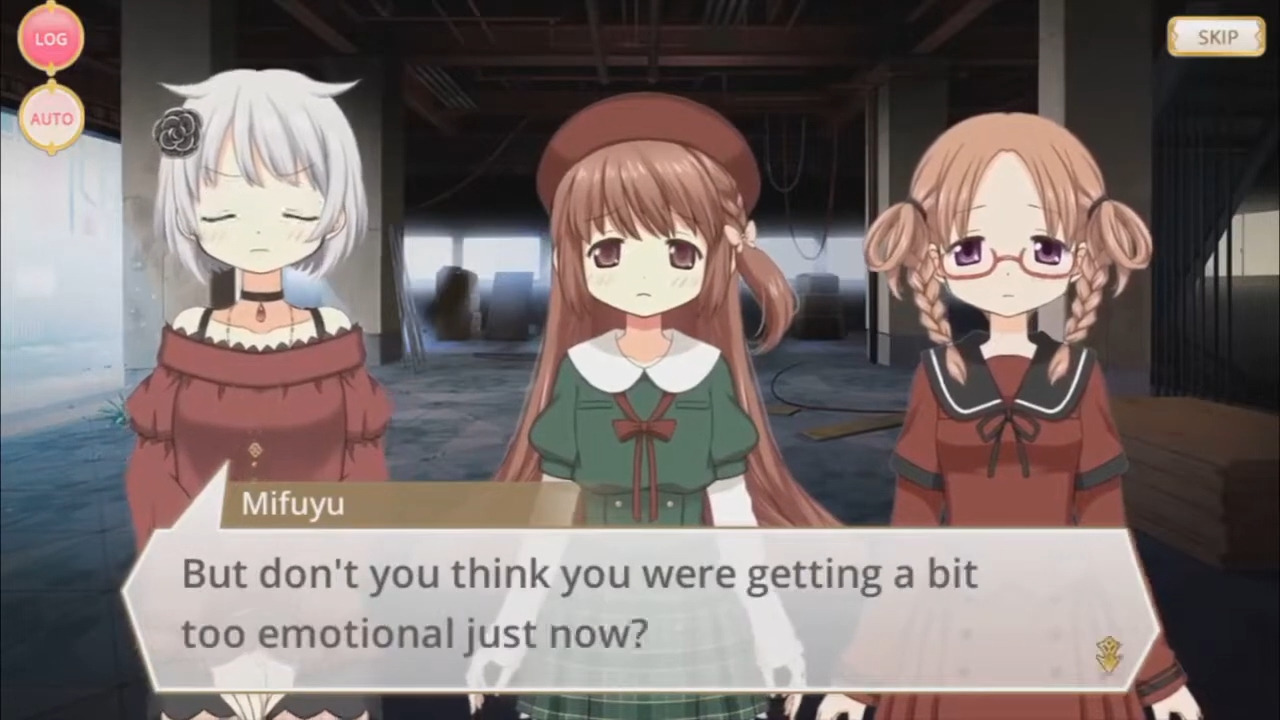 To continue with that scene, Touka then calmly, very calmly, explains her side of things. I'd like to point out much like I did in the essay above that her voice in this scene lacks the usual cheerfulness or anger, she doesn't have a mask on right now. There's a scene in the game's Arc 2 Chapter 5 that is our only voiced instance of Touka and Nemu alone together, and she sounds exactly the same, if a little more neutral. The tones of voice can be so telling with these two I swear- but anyway, back to the post-slap scene itself. Nemu, without prompting, reassures Touka of her own feelings about the matter, and that is the moment where they know they're on the same page again. The second Touka says that having those memories means she can do anything, they both know what they're going to do. All they're doing is reinforcing each other's understanding. Iroha even seems confused the more they talk. But they get it. And then Touka tells Nemu she was right to hide the truth from her in light of the risk (this is also where they start doing that thing they also have a bit of a tendency to do, which is sharing a personal space bubble, but shh, that only matters for my shipper brain's interpretation of this relationship, just ugh come on they're even forehead to forehead in this part). Nemu apologizes again, and does something we rarely see (because they rarely communicate on camera, verbally, and directly, which means we've basically only seen this once or twice before in the game). That being, she admits emotional vulnerability. I like to think the subsequent forehead thing is Touka's way of reassuring her without interrupting her in that moment, like a squeeze of the hand, since she's the one who'd have to bend over to reach eye level with Nemu.