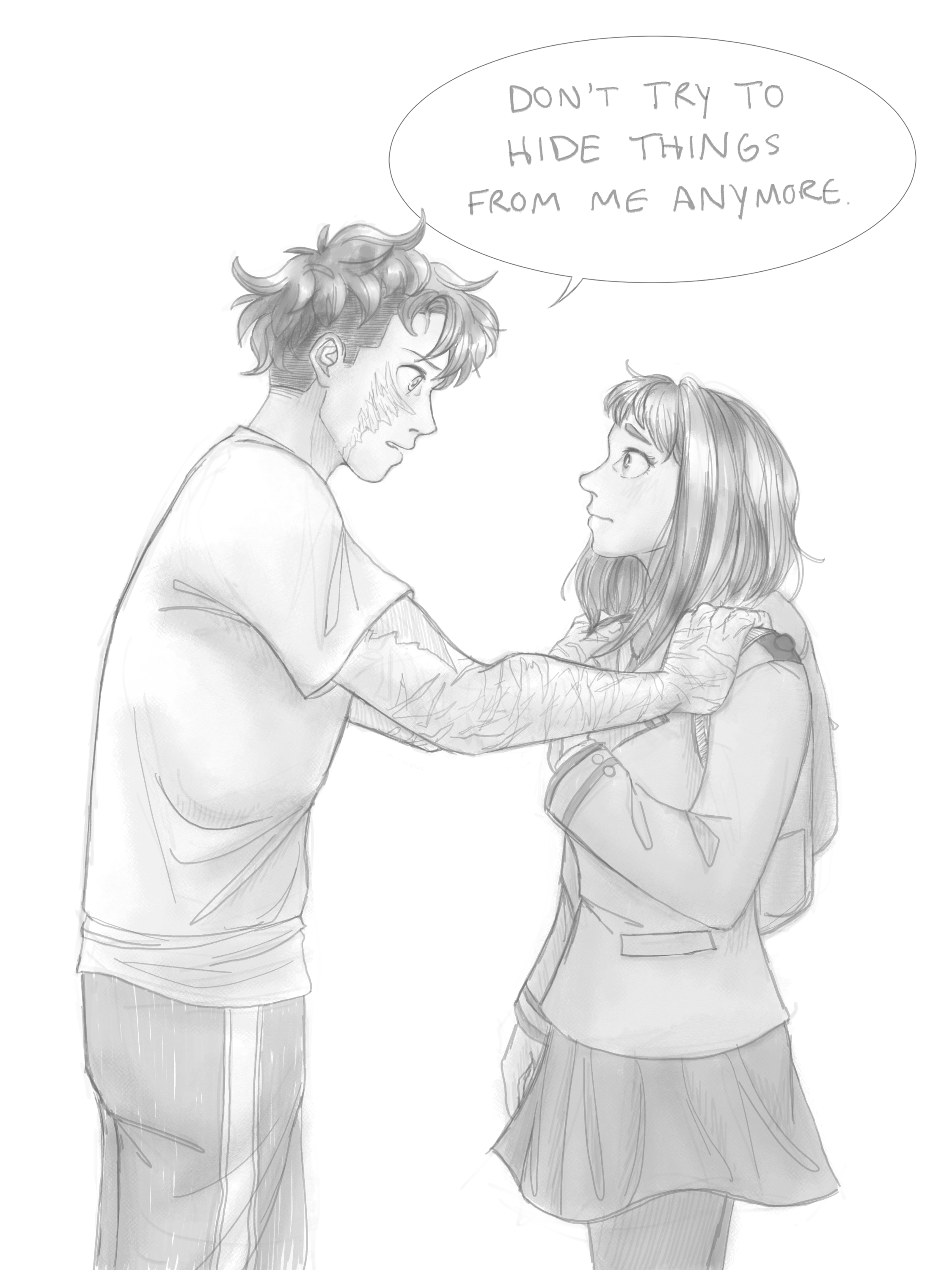 He took her other hand as well, then pulled their joined hands close to him, revealing her tear-streaked face at last. Izuku felt his heart start to shatter all over again, seeing such desperate despair on this girl made of sunshine.