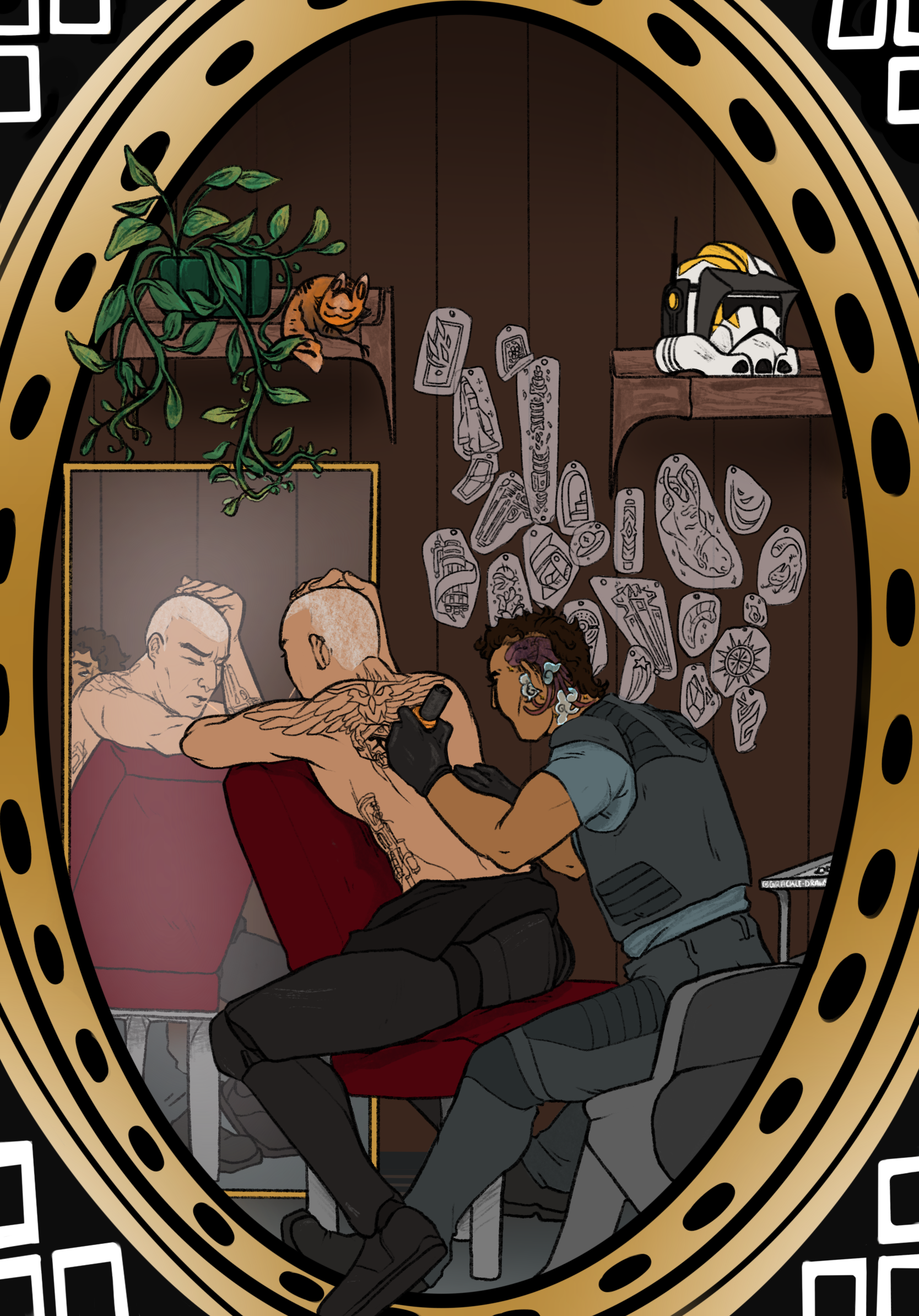 “Okay. Straddle the chair and get comfortable.” He cleaned his hands and put on a fresh pair of gloves, picking up his tools. When he turned back, Crosshair was ready for him. “Here we go.” He leaned in and touched his needle to skin to begin the tattoo. He quickly fell into the almost meditative state he used when he did tattoos, barely looking up from his work. He glanced up in the middle of it to check on Crosshair and saw his reflection in the mirror. Crosshair was holding his toothpick firmly in his mouth, his eyes closed tightly. Silent tears were running down his face. He brushed a hand over Crosshair’s other shoulder in a soft gesture of comfort and went back to his work. When he was satisfied, he sat back and sighed, rolling his neck and shoulders to work out the tension of being hunched over for nearly an hour. Crosshair gave a matching sigh and let his shoulders slump, opening his eyes for the first time to glance down at what little he could see of the tattoo.