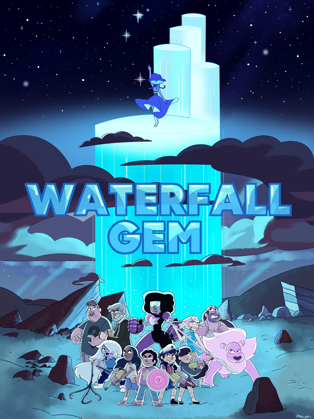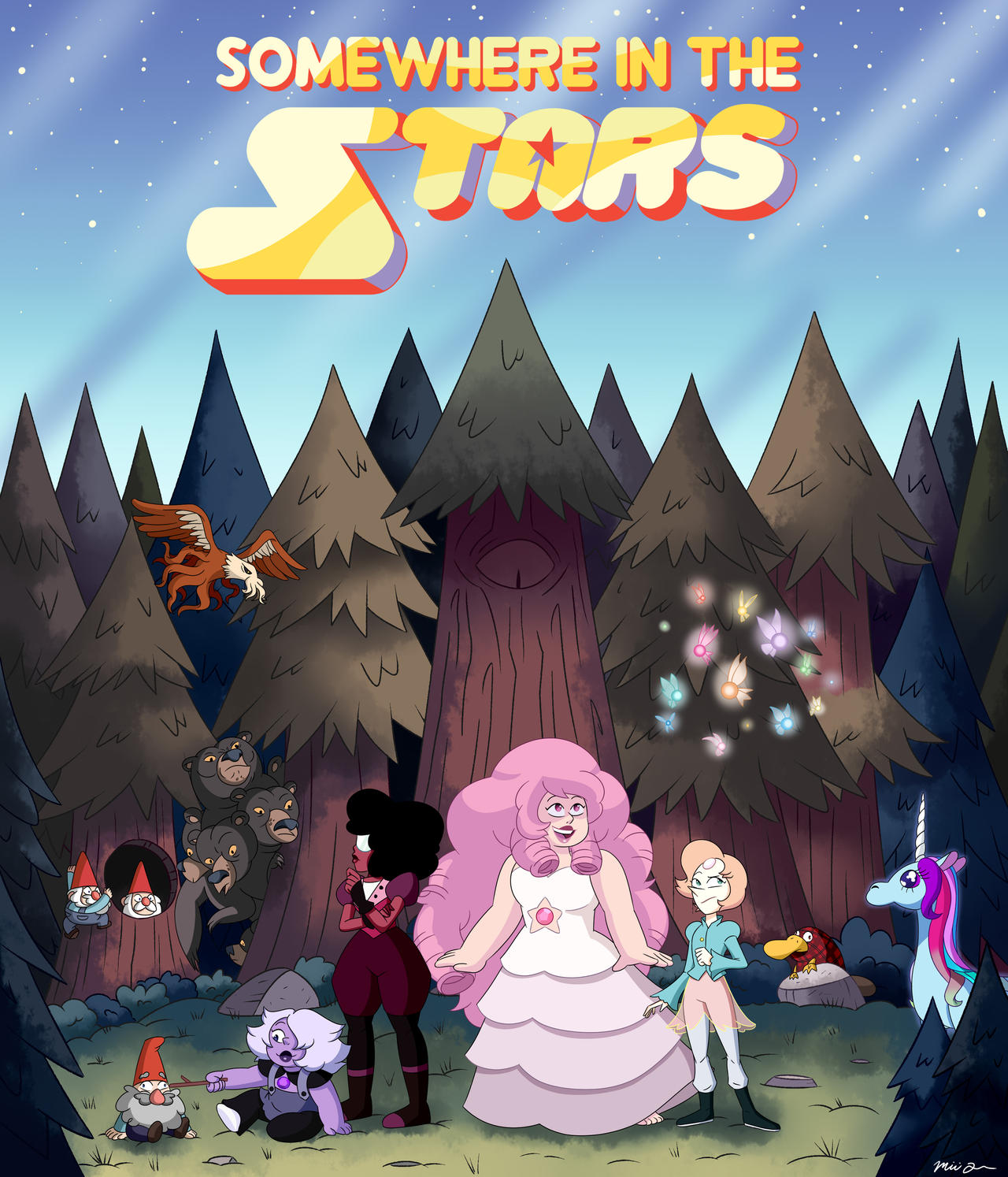 “Yeah!” Amethyst cheered as Rose swept them off their feet. She took a mighty leap into the air, carrying all three of them as they floated together into the valley awaiting them.