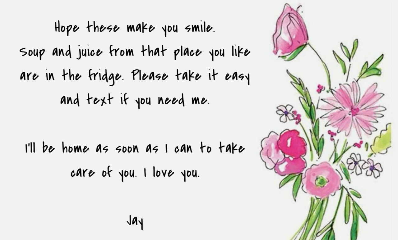 She grins back at him with her dimpled cheek, a smile bigger than any she has ever worn, that no number of flowers could ever bring out of her, but still she reaches for the card tucked into the roses at her bedside. The tears are instant, and the swell of her heart is painfully good.