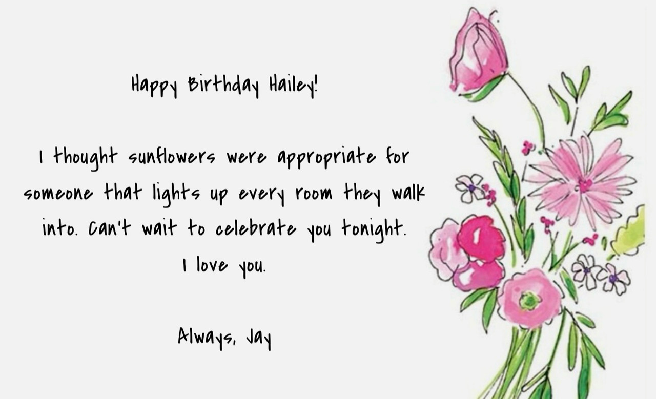 She gets flowers again on her birthday. It had always been a day much like Valentine's, one she didn't care to celebrate. She never had a reason until him, until he made it special for her. The little card attached to the yellow bouquet made her heart race at a gallop and had her cheeks flushing a beautiful shade of pink.