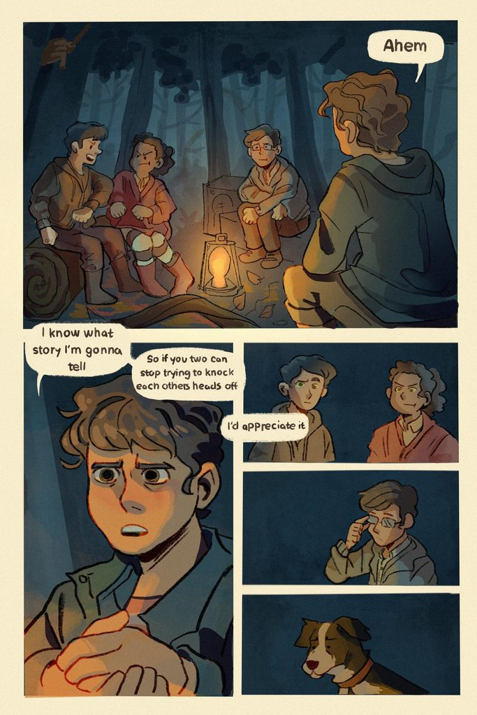 “I know what story I’m gonna tell,” he says, bringing his hands together with a sharp clap, “So if you two can stop trying to knock each other’s heads off for a bit, I’d appreciate it.”