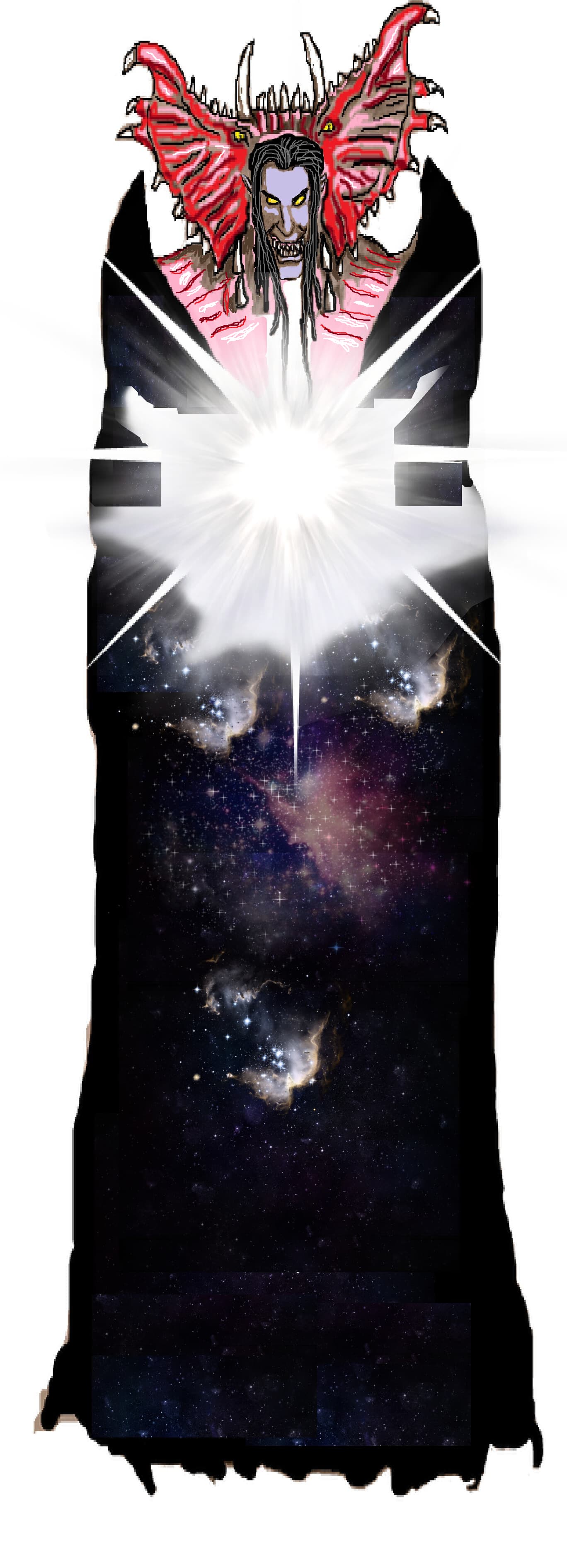 Satisfied, the cosmic vampire pulled his mouth into a vicious, twisted, sharp-toothed grin, his twin fangs and fearsome yellow eyes gleaming in the darkness.