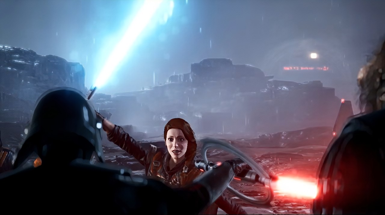 The AT-ST crashes to the ground in a flurry of explosions and debris, and Cal was glad to not sheath her lightsaber just yet. The hatch snapped open from the top of the walker, within the smoke was the pilot who immediately aimed his blaster and tried to take her down.
