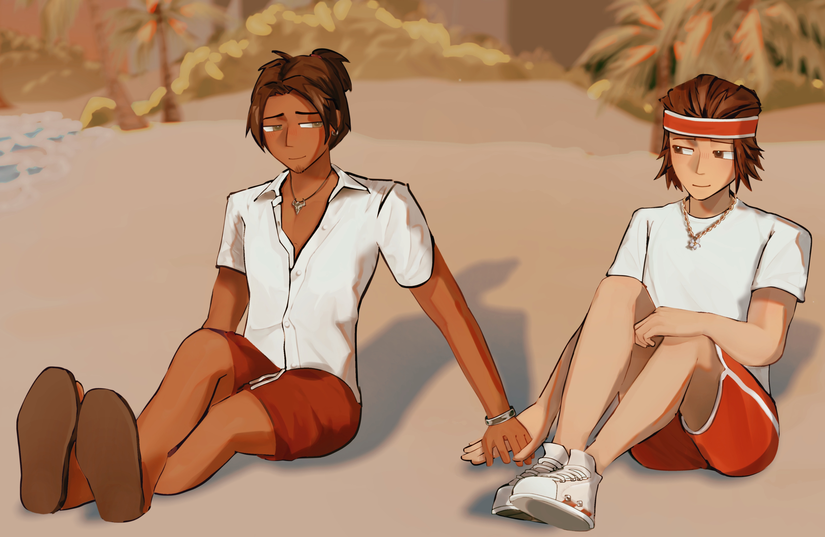 The rest of the evening had been a time filled with admirable glances and blushing grins from the two friends turned lovers. Once they concluded their big moment by the lake, Alejandro and Tyler got up, brushed off the sprinkles of sand still lingering from their shorts, and proceeded to walk back over towards their bikes.