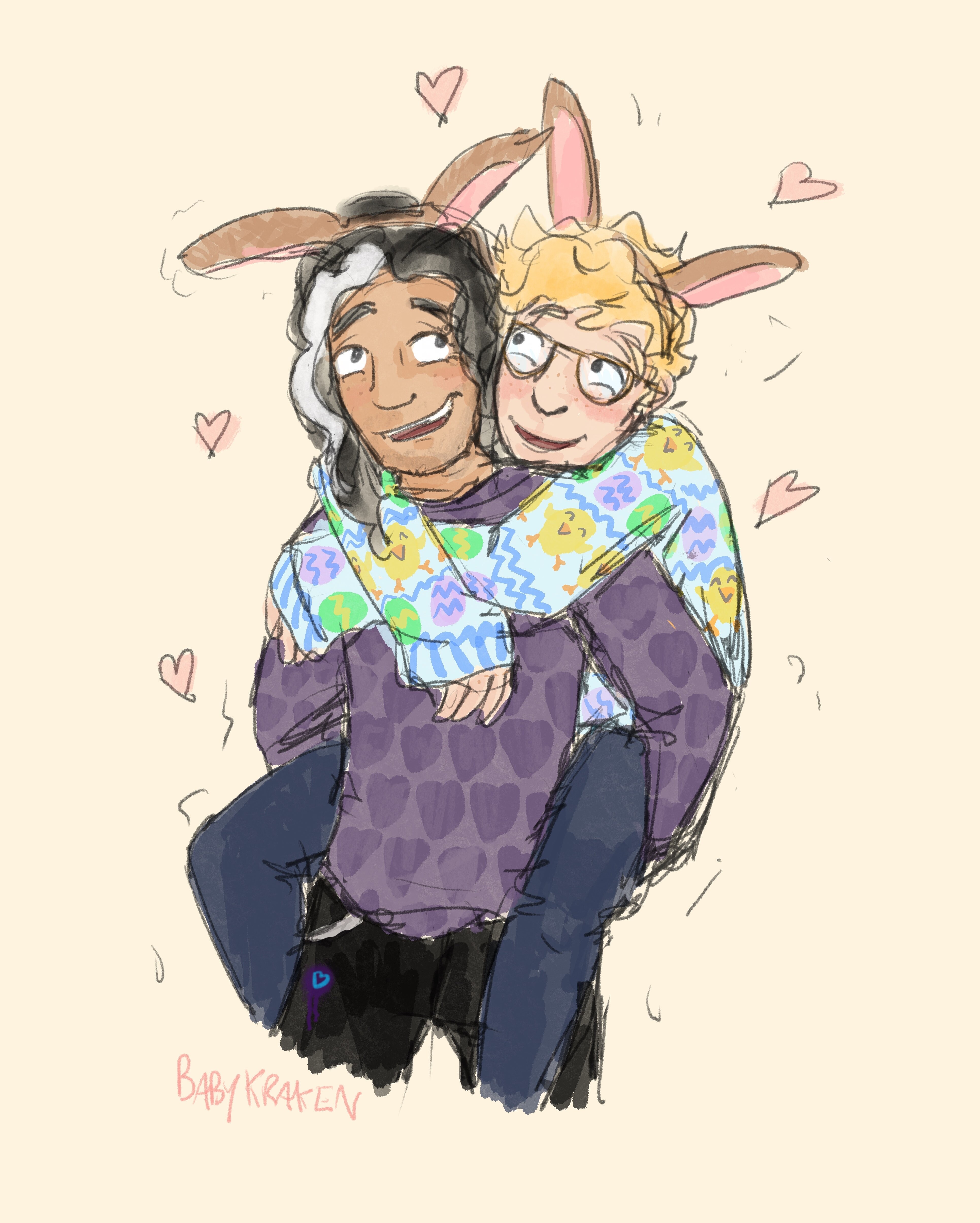 happy easter!!! BK & i were discussing what the boys would be up to over the easter break and she drew the CUTEST art of them in bunny ears (LOOK AT THEM!!! I'M WEEPING) so i just had to write a sweet little ficlet for them 🥺 they spend the week with mama teach who is long overdue a feature because she's the best. she's their no1 supporter (is she basically the two of us??? Yes) (also for the other week of the holidays they spend it in stede's flat eating chocolate and fucking and licking chocolate off each other, obvs. and also studying because they do need to graduate...)