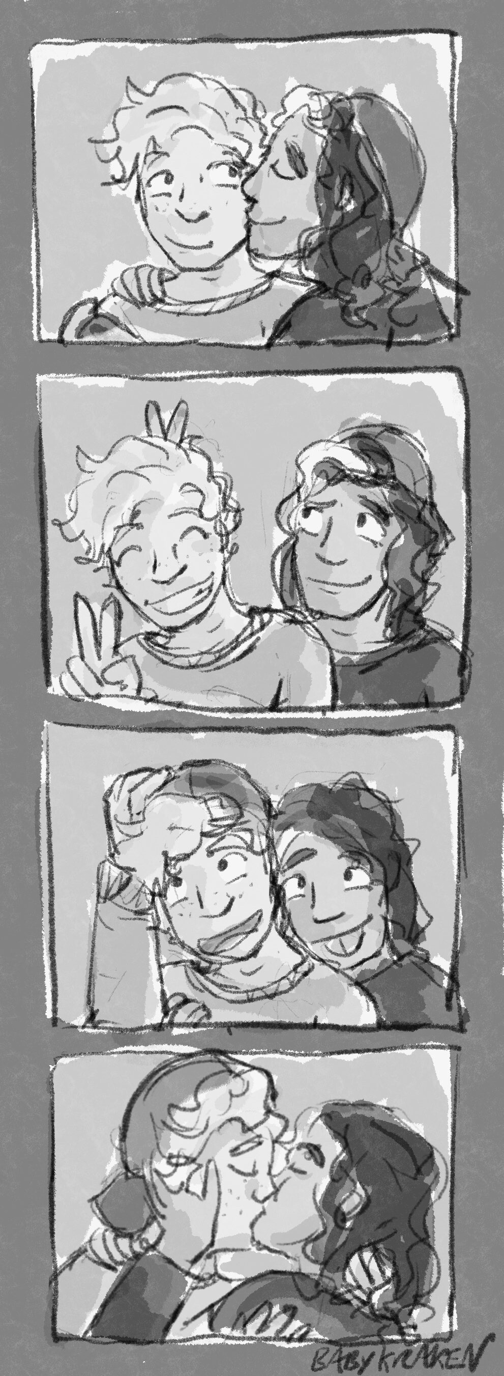 Ed holds him close and kisses his cheek, and Stede’s face is rosy when he pulls away. He’s grinning and throwing up a peace sign in the next, then Ed laughs right beside his ear, “Let’s do a silly one”. With no other warning, Ed whips off his cap and plops it on Stede’s head, smooshing their faces together and sticking his tongue out cheekily. And what can Stede do other than kiss him about it? He twines his fingers in Ed’s hair, gently tugging, and Ed moves with him, cupping his cheek in one hand and clutching the back of his neck securely with the other.