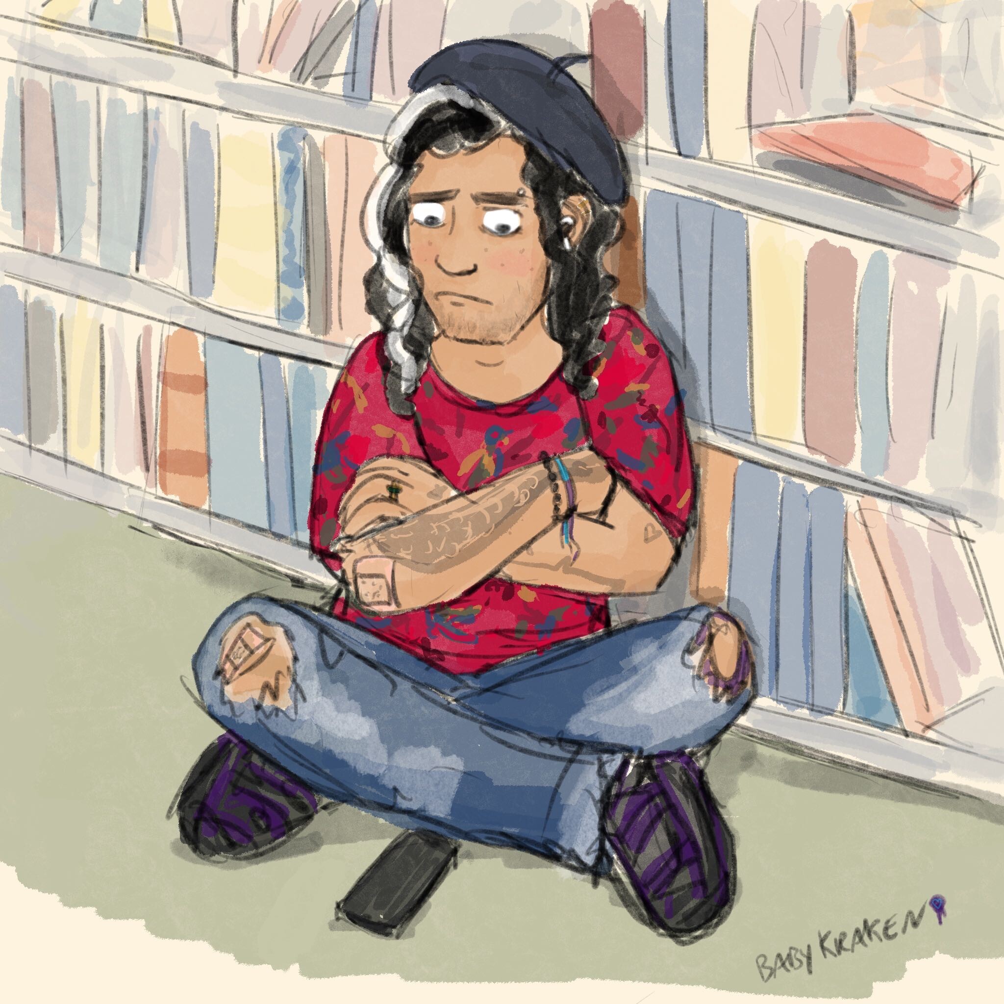 Ed grabs the Sulking Beret from his bag and shoves it onto his head with a petulant huff. Then, he leans back against the bookshelves, arms crossed and lips pushed into a pout. Fine! He’ll wait! Stede owes him so many kisses later for this.