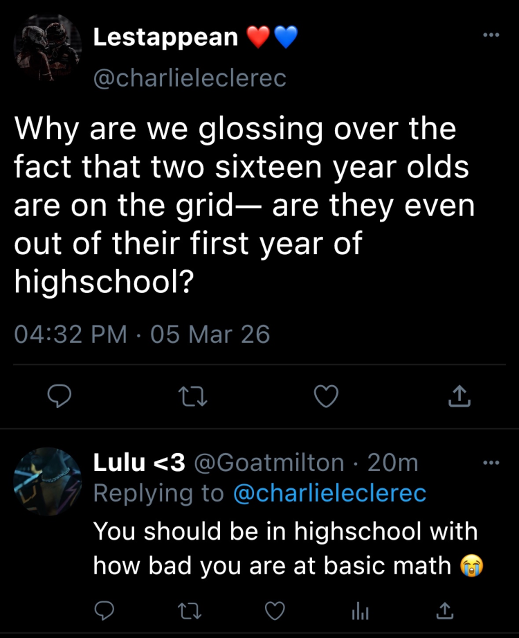Isaiah felt eyes on him as he shifted and grabbed his mic. Shrugging the crawling feeling off, he spoke. “I was in the Red Bull Racing driver’s program from F4 onwards, yes, but the team and I really came to head in 2025. I was told to wait for a seat, which I would've openly been fine with if it hadn’t been for the behavior I was subjected to.” Isaiah continued, “The team, excluding the drivers, had a habit of saying I was too cocky and overconfident. Something about how I wouldn’t fit the team regardless of skillset, because I was too out there or public. Of course, it minimized after Horner was removed, but it wasn’t optimal.”