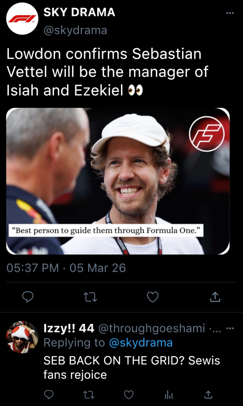 The Cadillac team already seemed busy, focusing on various things. Though one was sitting down, dressed in his navy blue and gold fireproofs, it was Sebastian Vettel. The twins manager. Or well, Isiah’s permanent manager, Zeke was still looking for his.