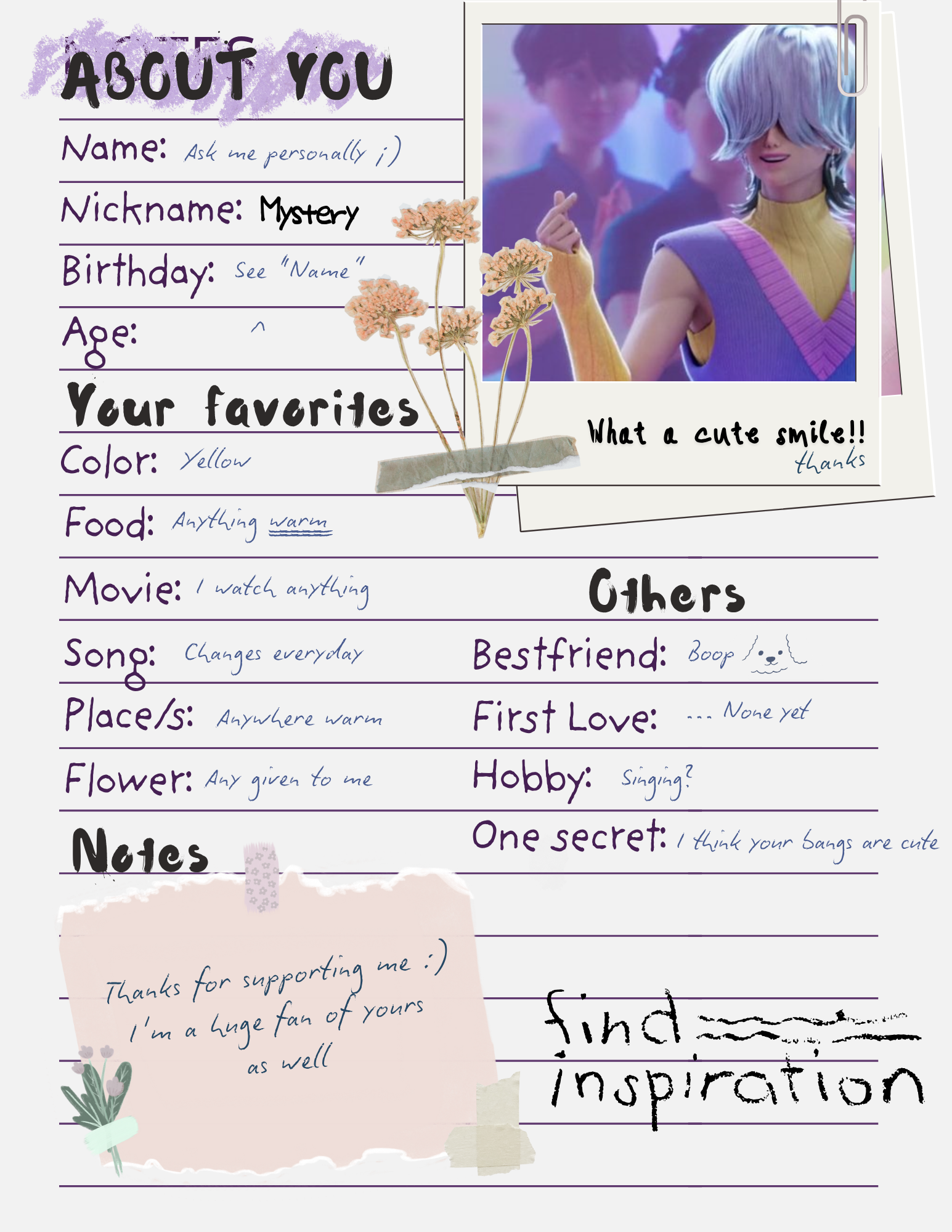 - I NEED NAME. HEIGHT. BLOOD TYPE. FAVORITE SNACK