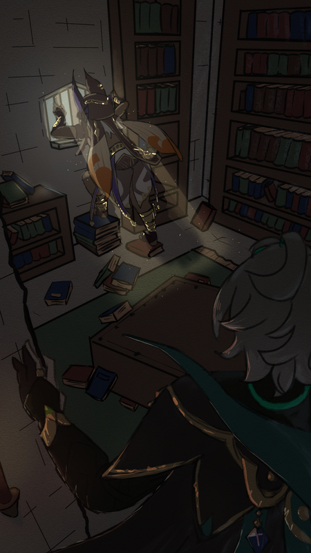 “I realized early on there wasn’t any food here,” he explains, and when Cyno turns to look at him, he swears the man is glowing from the dendro energy that clings to him. “The first day, I searched everywhere for some sort of pantry or foodstuff. I thought surely there had to be something. The Sages wouldn’t have gone through the trouble of banishing me if they wanted me to die when they could just kill me. But, I couldn’t find anything. Resigned to my fate, I figured, may as well read as much of the knowledge here before I starved. It wasn’t the long and carefree life I had wanted, but it wasn’t a bad one either, and dying while reading certainly seemed like an appropriate way to go.