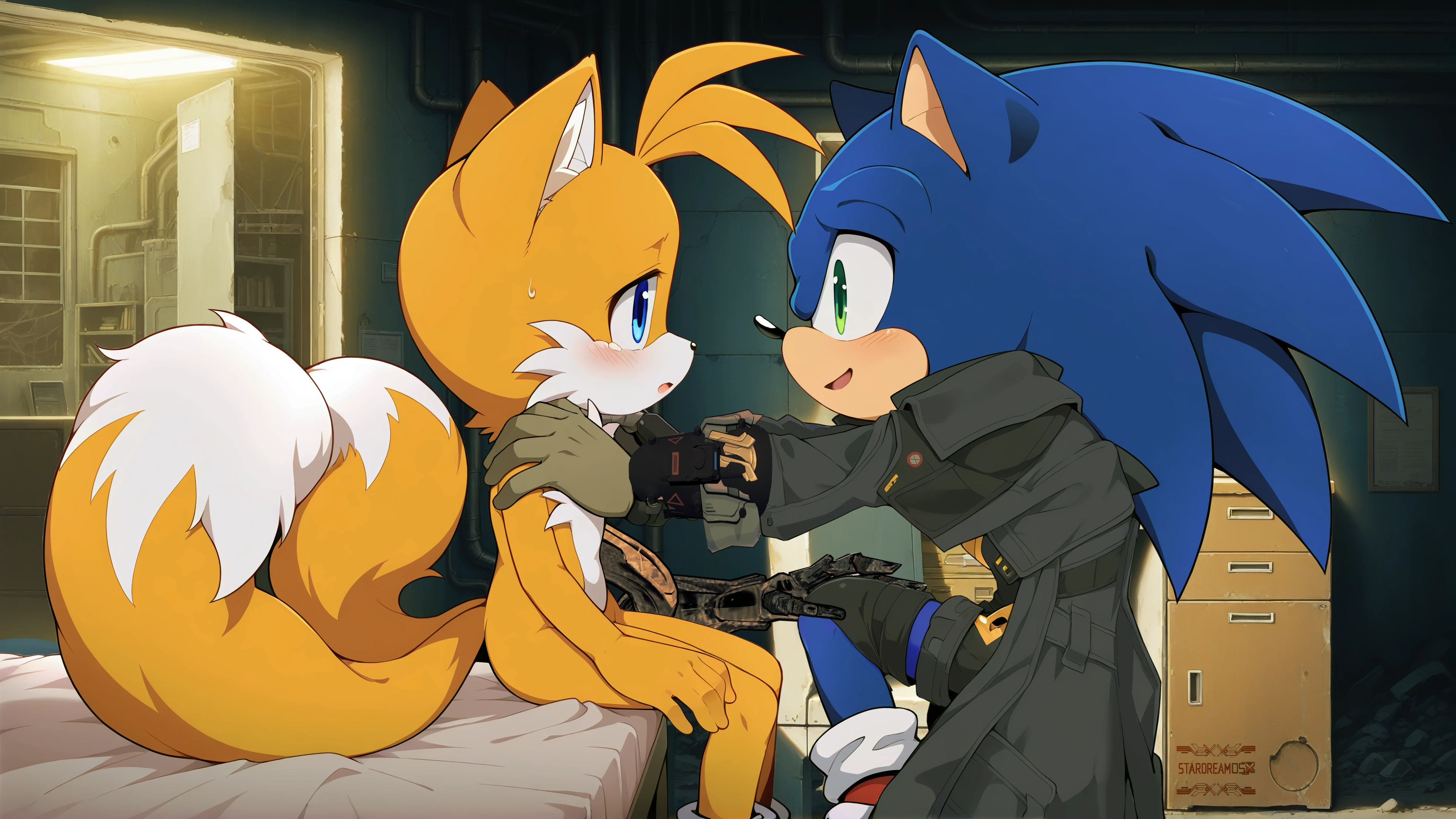 Tails blushed and playfully smacked Sonic. "Flirting again, you—ugh, fine." He shook his head and firmly grasped Sonic's arm, feeling the warmth radiate from it, as if letting go would mean they would be separated again.