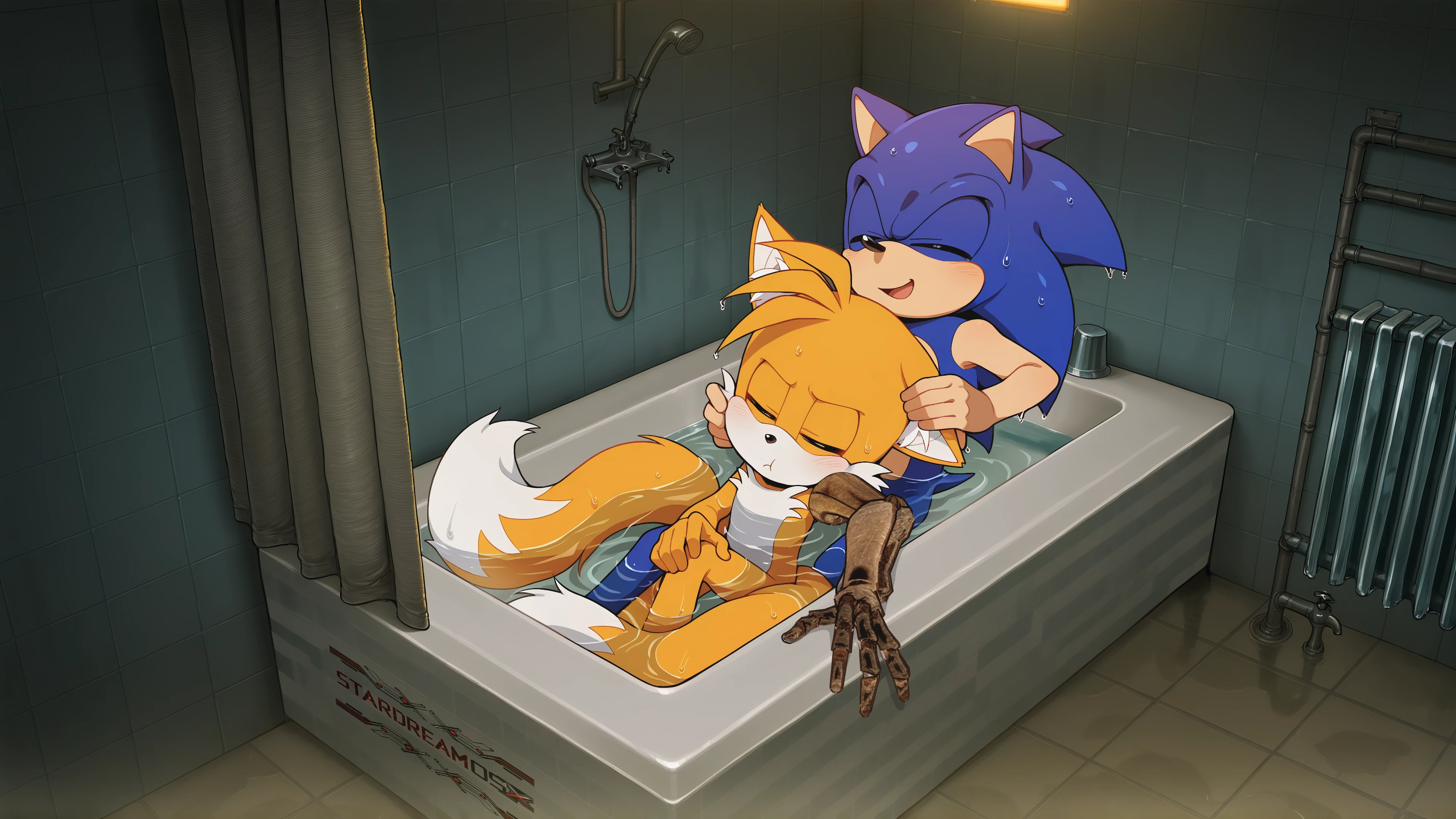 Tails thought with a blend of yearning and happiness, wishing they could kiss like this forever… With his last shred of rationality, he gently pushed Sonic away. "Okay… okay… we should probably figure out what's going on in this world first… I don't want to sleep on the side of the road tonight, okay? Once we find a place to rest, we have all the time in the world… to do whatever we want…♡"