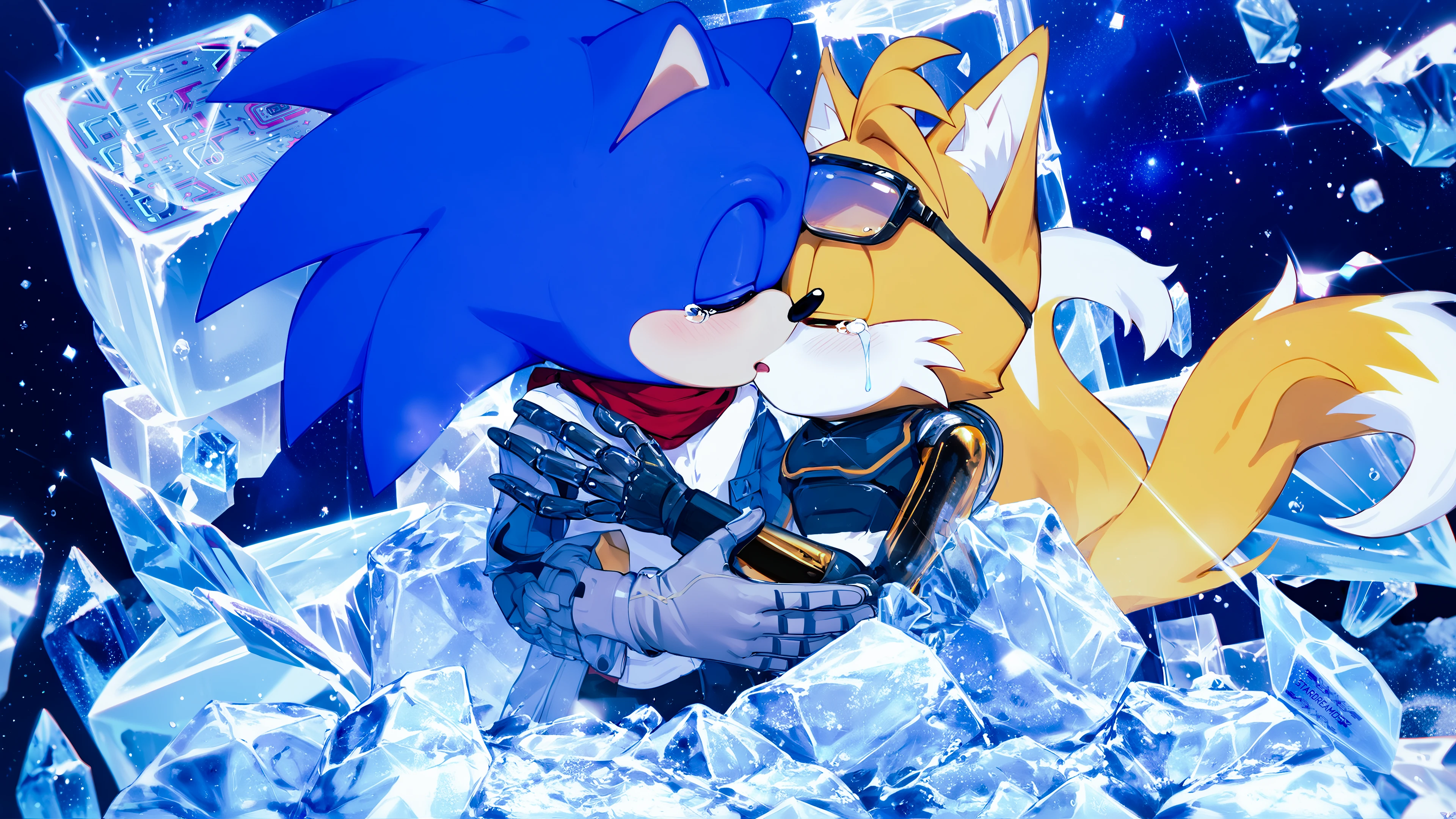 Tails narrowed his eyes flirtatiously, licking his lips. This tempting gesture struck Sonic deep in his heart, causing his quills to instinctively perk up in excitement.