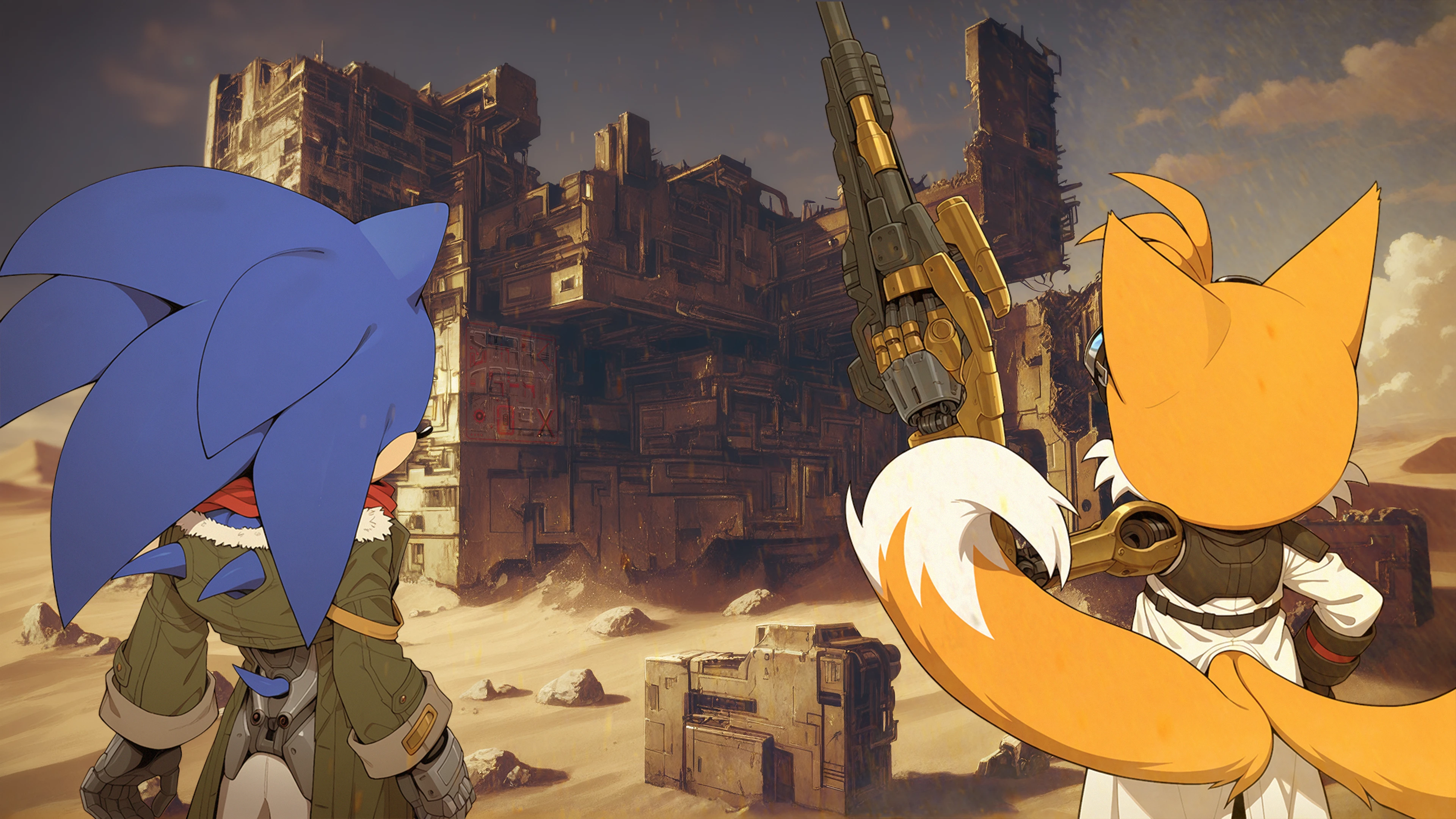 "It's been so many years since we flew like this, Sonic," Tails reminisced, gazing down at the pristine, untainted land. "After all, it's impossible to fly while wearing a gas mask. You'd tire out in no time."